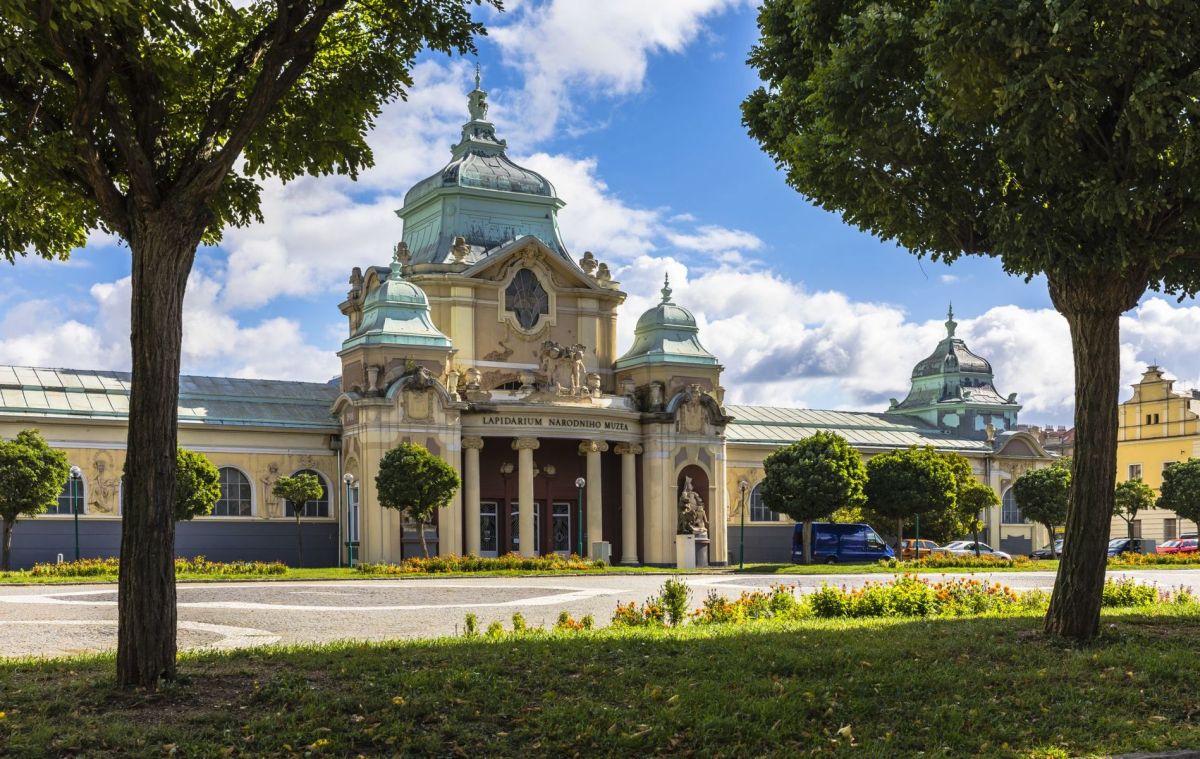 Во времена основания коллекции были посвящены, прежде всего, естествоведению. Франтишек Палацкий вместе с другими молодыми патриотами внесли особый вклад по расширению музея в направлении исторических коллекций и специализации в области культуры и науки. Растущие коллекции требовали больше пространства. Во время разрушения городских стен вокруг Нового города (Nové Městо) др. Ладиславу Ригеру (Ladislav Rieger) удалось достичь того, чтобы городской совет подарил участок земли, где ранее стояли Конские ворота (Koňská brána), нынче разрушенные, под новое помещение музея. В 1883 году Земский комитет объявил конкурс на проект нового здания на участке площадью 13 500 м2. Первое место занял архитектор Йозеф Шульц (Josef Schulz), которому было поручено руководство строительством. В 1885–1890 гг. был возведен просторный неоренессансный объект, цена которого достигла 1 935 000 золотых. На плане объект представляет собой правильный прямоугольник со сторонами 104 и 74 м, в наивысшей точке достигая 70 м от фундамента. От фонтана к башне ведет 338 ступеней. В здании более трех с половиной тысяч дверей и 562 окон. В комплексе – два прямоугольных двора, разделенных центральным корпусом. Четыре угла здания выполнены в форме четырехгранных башен с куполами. Над центральной частью главного фронтона возвышается главная башня с куполом и световым отверстием.