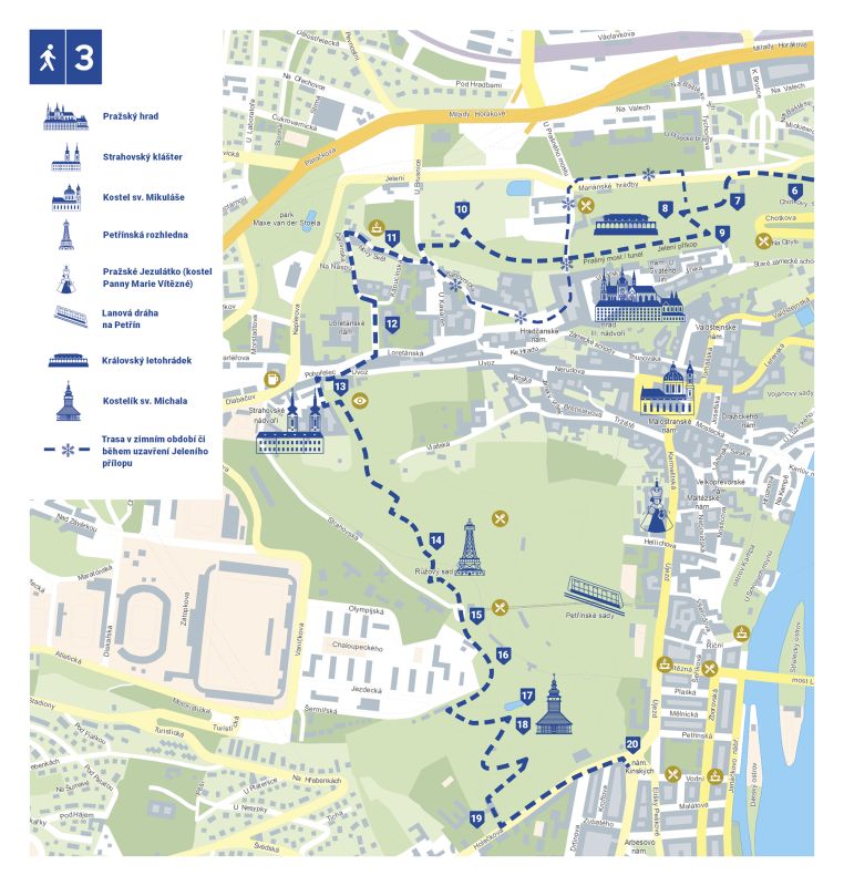 → улица Loretánská → Погоржелец (Pohořelec) → 13 Страговский монастырь (Strahovský klášter) → Променад Raoula Wallenberga →