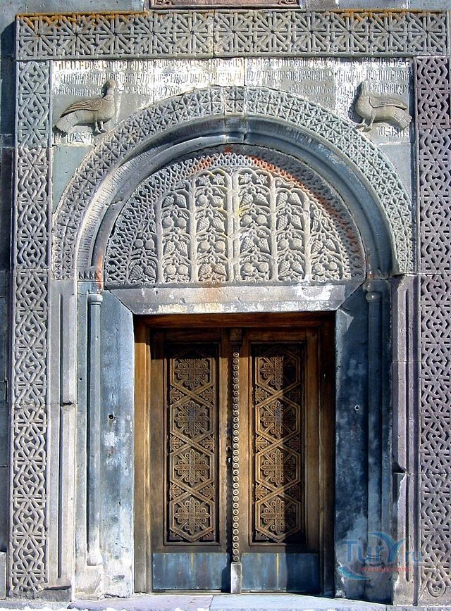 В немногих храмах Армении можно встретить такое богатое скульптурное убранство; растительная и геометрическая орнаментика здесь щедро комбинируется с объемными изображениями животных. Не менее привлекательны высеченные под барабаном купола рельефы с изображениями голов животных, птиц, человеческих масок, различных розеток, образующих своеобразный скульптурный фриз.