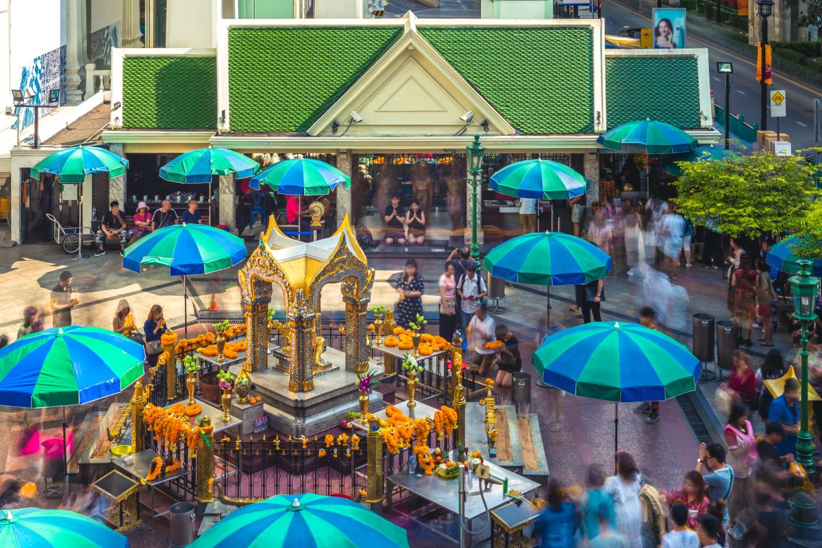Алтарь Эраван - это индуистский храм, расположенный перед отелем Grand Hyatt Erawan на перекрестке Ratchaprasong на Ratchadamri Road в суб-районе Lumphini, Pathum Wan District, Бангкок. И тайцы, и иностранцы любят посещать это место и поклоняться этому знаменитому святому объекту. Многие групповые туры из многих стран организуются специально, чтобы отдать дань уважения Пхра Пхром. История этого священного объекта началась в 1951 году, когда генерал полиции Пхао Сриянонд назначил открытие отеля Erawan на перекрестке Ратчапрасонг для приема иностранных гостей. Говорят, что в первый период существования было много неудач. Позже, когда в конце 1956 года строительство было почти завершено, исполнительный директор Syndicate of Thai Hotels & Tourists Enterprises Limited связался с контр-адмиралом Луанг Сувичаном Паэтом, главой военно-морского флота, врачом и мастером сидячей медитации, чтобы выбрать благоприятный день и время для открытия отеля. Однако контр-адмирал Луанг Сувичан Паэт предложил надлежащее приношение. Чтобы решить эту проблему, отель должен был поклоняться Пхра Пхром, чтобы устранить препятствия, и должен был построить храм Эраван и дом духов сразу после того, как здание было полностью построено. В результате был построен храм, спроектированный г-ном Рави Чомсери и М.Л. Поом Малакул. Статуя Пхра Пхрома была спроектирована и отлита из позолоченной штукатурки г-ном Джитром Пимковитом, мастером-ремесленником из Департамента изящных искусств. Затем 9 ноября 1956 года перед отелем Эраван был установлен храм Пхра Пхром. Святилище Эраван в отеле Эраван стало первым крупнейшим храмом Пхра Пхром. Согласно индуистским верованиям, Пхра Пхром - бог строительства. У него 4 лица, каждое из которых символизирует 4 направления - север, юг, восток и запад; поэтому он может видеть и защищать все как в человеческом мире, так и на небесах. Он может избавить от трудностей и препятствий и с уважением ободрить прихожан на удачу и успех. В настоящее время святилище Эраван в отеле Эраван находится под наблюдением «Фонда Тан Тао Махапром». Туристы и желающие могут ежедневно посещать священный храм Эраван и поклоняться ему в отеле Эраван бесплатно.