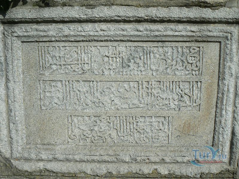 На восточном парапете с южной стороны моста воздвигнута гранитная плита с выгравированной надписью на турецком языке. На ней написано, что мост построен в 1470 году при султане Мехмеде II-ом. С турецкого языка название переводится как "мост невесты". Есть несколько легенд, которые объясняют такое название. Согласно одной из них, строительство моста совсем не шло - всё построенное за день сносилось водами реки за ночь. Поэтому мастера решили, что для успешного завершения строительства необходимо принести в качестве жертвоприношения одну из своих жен. Такой участи решено было удостоить первую, что принесет утром еду своему мужу. Первой пришла невеста мастера Манола и её тело зацементировали в основании моста.