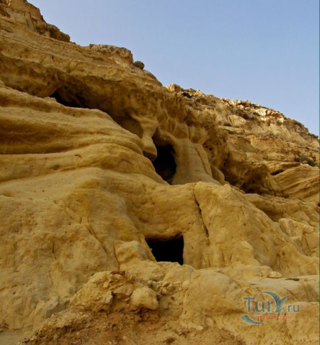 Множество пещер было выдолблено тысячи лет назад в мягком белом известняке в северо-западной "стене" залива Paximadia. Искусственные пещеры были созданы в эпоху неолита, здесь жили люди, причем, в некоторых пещерах было несколько помещений, а ниши украшены резным орнаментом, многие из них имеют номера, лестницы, кровати или окна. В I и II веках они использовались как римские пещеры-гробницы. Одну из пещер называют "Brutospeliana", потому что, согласно легенде, ее часто посещал римский Брут. В 60-70-х годах XX века этот райский уголок облюбовали хиппи, и даже жили здесь пока в 70-х годах местные церкви не изгнали их. И археологии опечатали пещеры.