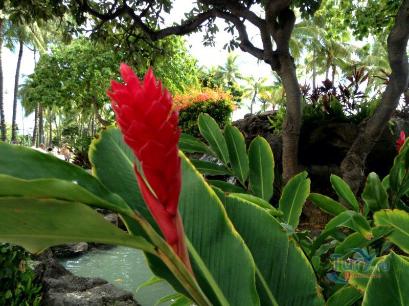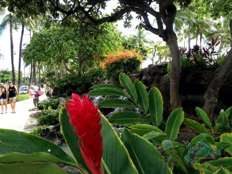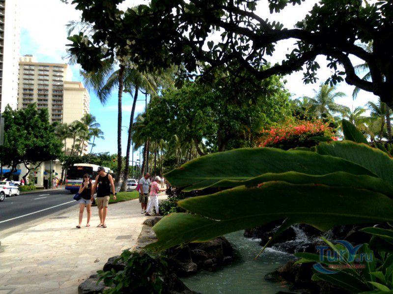 Композиция "Водопад на камнях" расположена на улице Калакауа Авеню (Kalakaua Avenue) у пляжа Кухио-Бич (Kuhio Beach) на Вайкики, в южной части Гонолулу. Мощные струи воды прорываются сквозь каменные глыбы и успокаиваются, очутившись в небольшом водоеме, дно которого усыпано золотистым песком. Берега водоема поросли буйной тропической зеленью и яркими каскадами цветов. Композиция "Водопад на камнях" - любимое место прохожих, дарящее прохладу в знойный день, и ласкающее слух журчанием воды. Это то место где любят фотографироваться туристы, которых на Вайкики очень много.