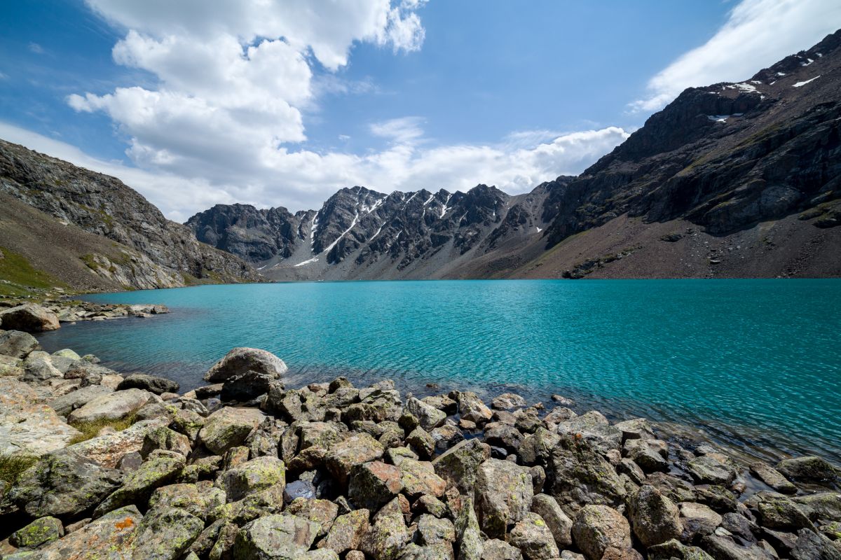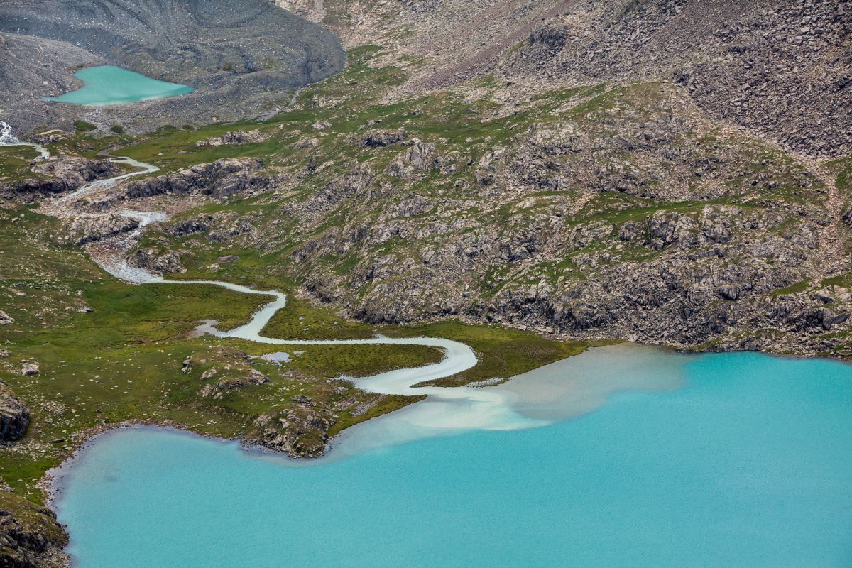 Озеро Ала-Куль расположено среди скалистых хребтов Терскей Ала-Тоо, на высоте 3532 м. Площадь ледникового озера составляет менее 1,5 км 2 , глубина достигает более 70 м. Это «пестрое озеро» меняет свой оттенок в зависимости от погоды.