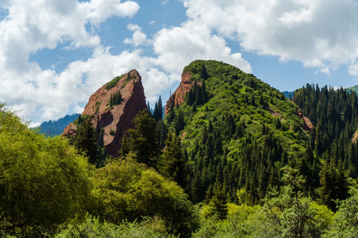 Живописное ущелье Джети-Огуз расположено в 28 км к юго-западу от города Каракол. Его название в переводе с кыргызского языка означает «семь быков», поскольку здесь протянулась громадная стена из семи красно-бурых скал, напоминающих выстроенных в ряд яростных быков. Особенно романтично выглядит скала «Разбитое Сердце», расположенная у въезда в ущелье. На высоте 2200 м построен лечебно- оздоровительный курорт Джети-Огуз известный своими геотермальными источниками. В ущелье Джети-Огуз на высоте 2500 м находится Водопад Девичьи Слезы. Чистейшие воды высокогорных ручейков множеством струек падают вниз по 40-метровой крутой скалистой стене и пленят взор, напоминая нежные девичьи слезы.