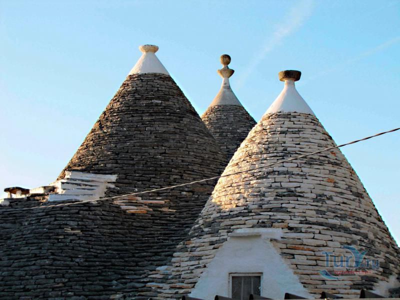 Оригинальные, похожие на сказочные домики, трулли располагаются в двух районах города: Айя-Пиккула и Монти. Название этих сказочных домиков произошло от слова "Трулло", что в переводе с латинского означает купол, то есть домики с куполом. Трулло представляет собой однокомнатную конструкцию с конической крышей, увенчанной каменным шпилем и разукрашенной рисунками, христианскими или языческими символами. Основная особенность таких построек заключается в том, что они возводились без использования цемента или каких-либо других скрепляющих растворов.