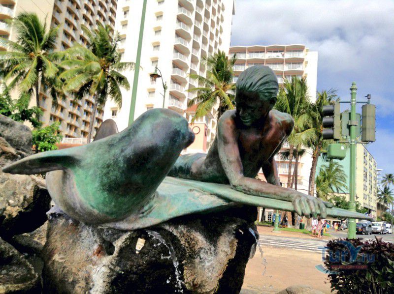 Скульптура Makua and Kila установлена прямо у пляжа Kuhio Beach в районе Вайкики - знаменитом районе Гонолулу на острове Оаху, на Гавайях.