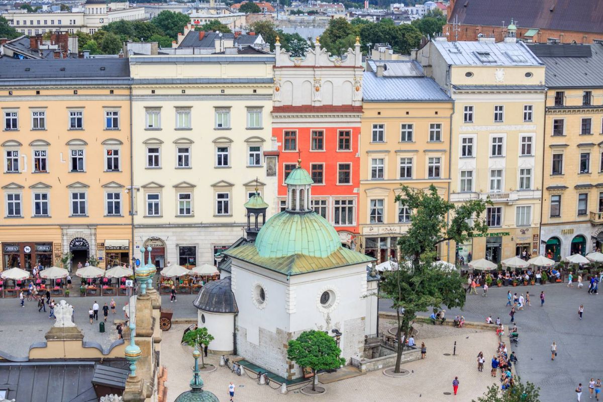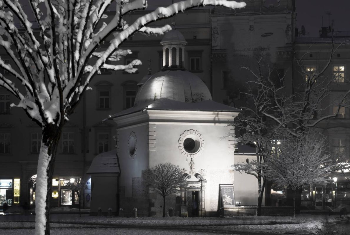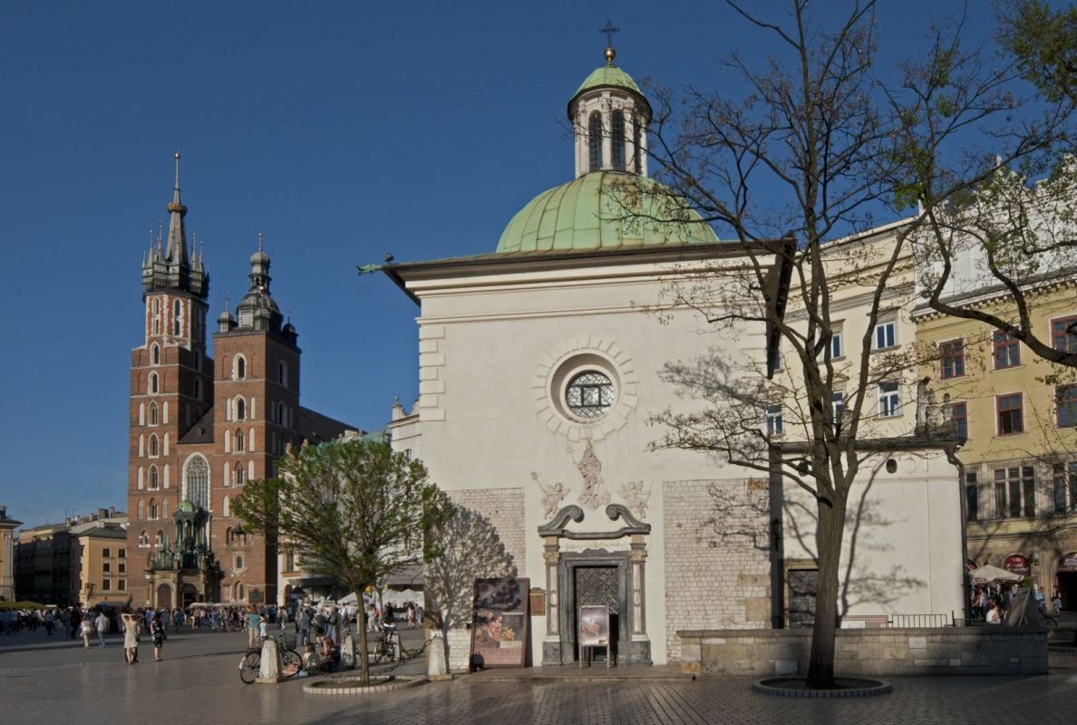 Что этот маленький, невзрачный костел делает на представительной, красивой Главной рыночной площади Кракова? К тому же стоит боком?