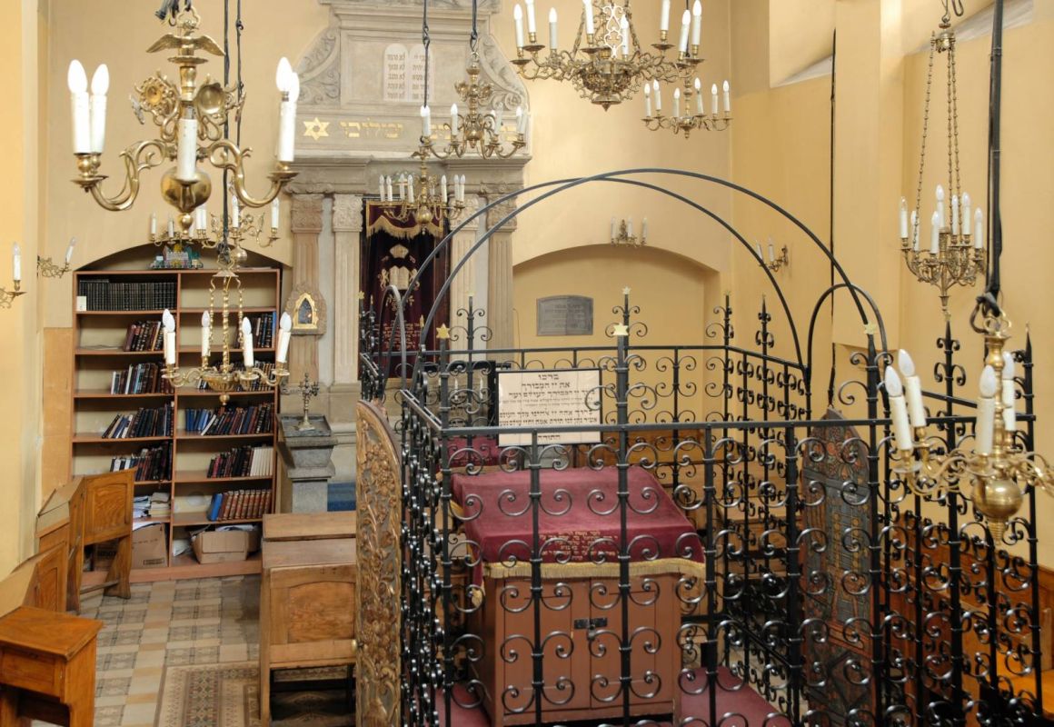 - каменный арон ха-кодеш эпохи позднего Ренессанса, заключенный в двойные пилястры и увенчанный досками декалога