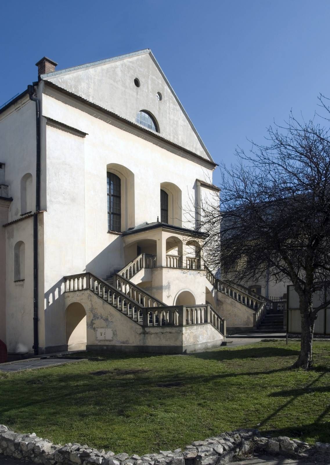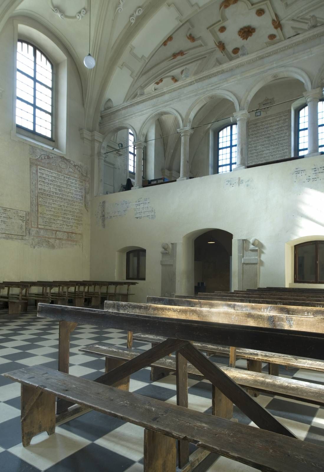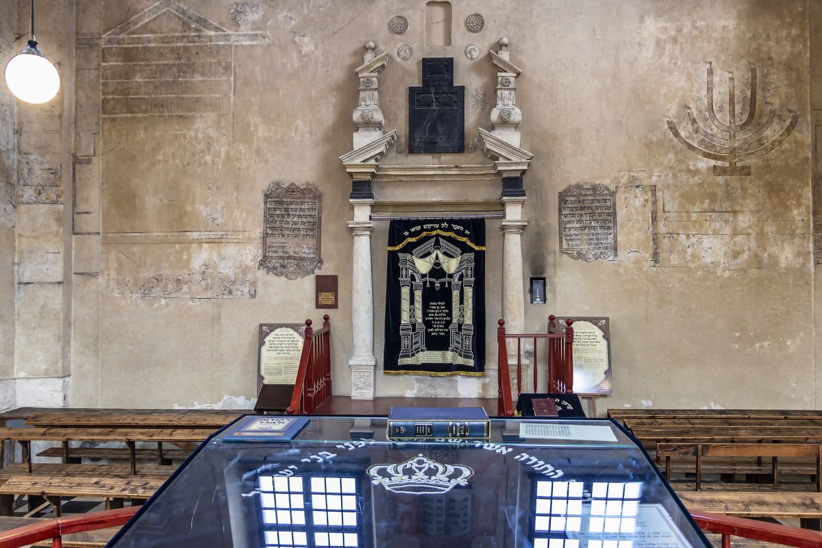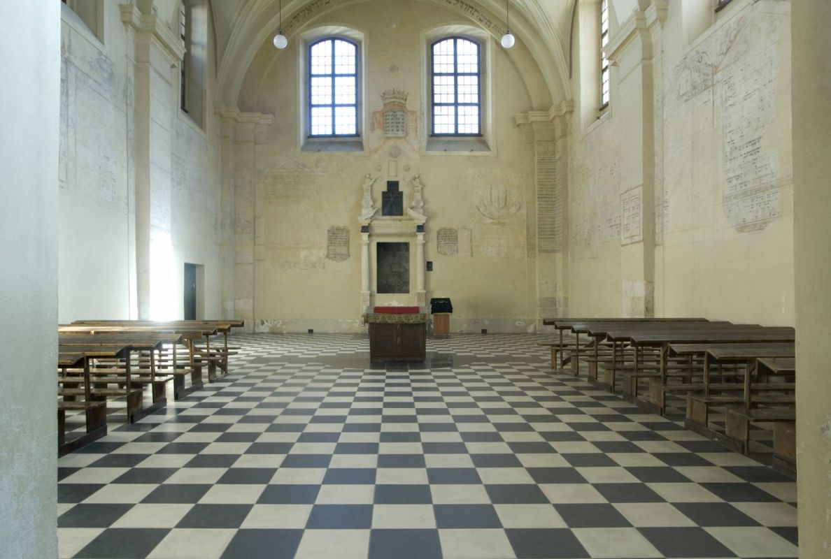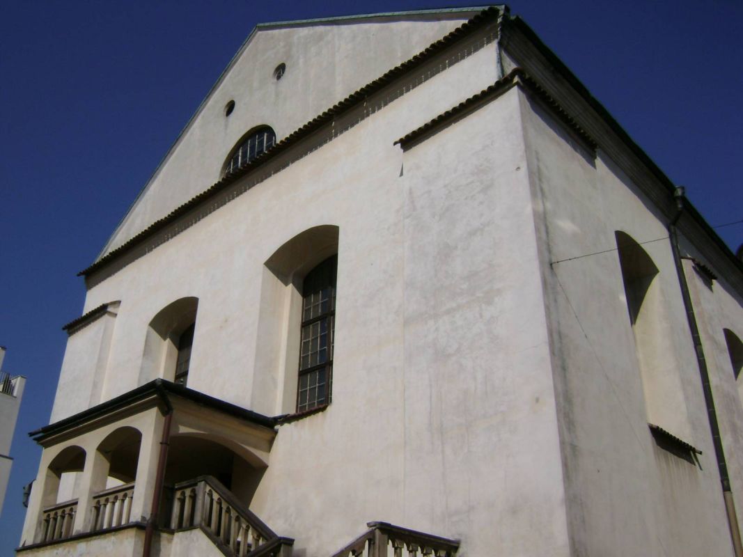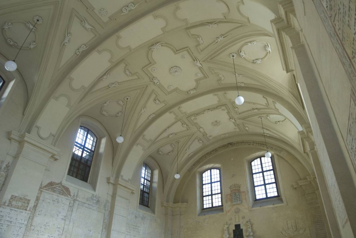 Единственным декоративным акцентом снаружи здания является барочный входной портал входа с улицы Исаака. Уже в ХХ веке к переднему фасаду была достроена двухпролетная лестница с арочным крыльцом, ведущая в женскую галерею, называемую бабинец. Внутри же взгляд притягивают полихромия в виде литургических текстов, окруженных украшениями. Древнейшие датируются периодом сразу же после возведения синагоги.