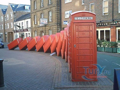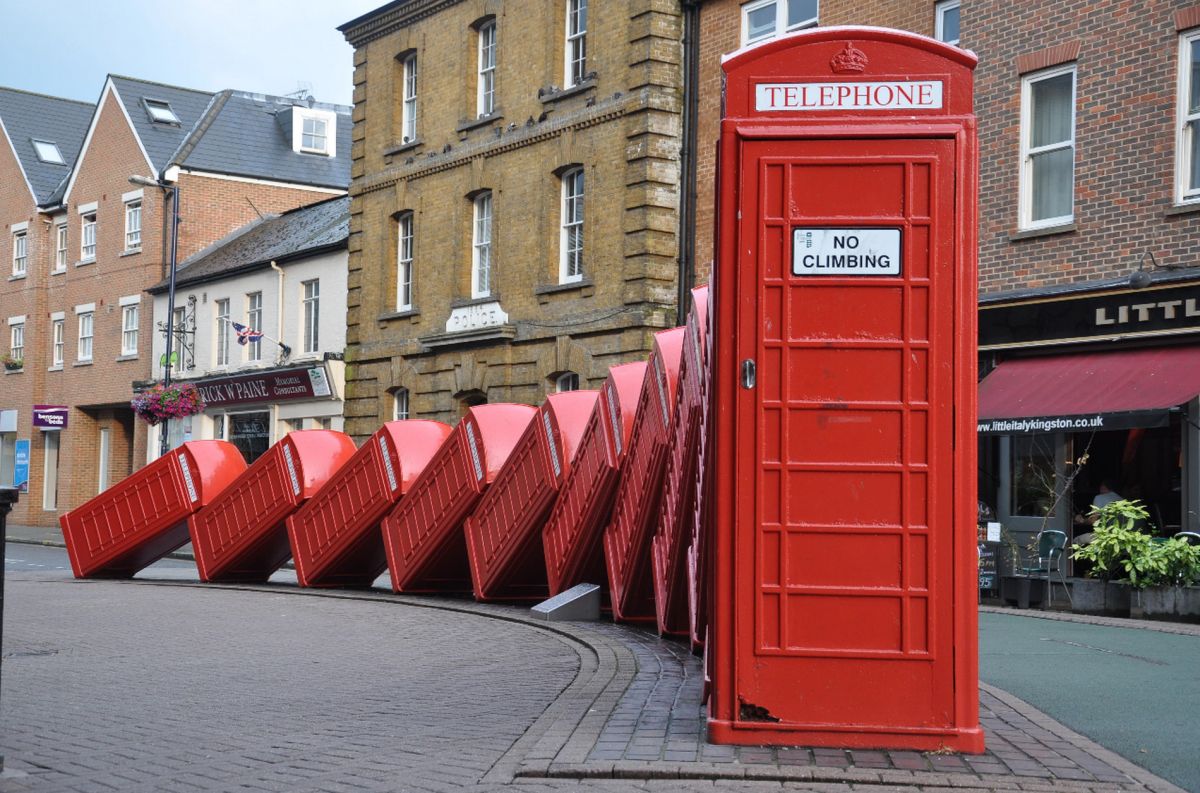 Одна из самых необычных достопримечательностей Кингстона – инсталляция в стиле «анти-минимализм» шотландского художника Дэвида Мача «Out of order» («не работает») - более известна как «Красные Телефонные Будки». Двенадцать списанных телефонных будок, классической модели К6, падающих друг на друга по принципу домино, были представлены публике в 1988 году. Композиция олицетворяет собой символ целой эпохи, которая, к сожалению, уходит в прошлое, ибо автоматы заменяют мобильные телефоны.