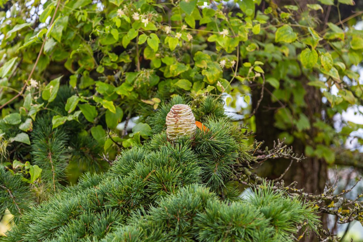 Впечатляющие и хорошо сохранившиеся образцы сосны (Pinus pinea) интересны не только своими вкусными и съедобными семенами - кедровыми орешками, но и своей отчетливо правильной зонтичной кроной на старых деревьях и глубоко бороздчатой красновато-коричневой корой, которая отслаивается в толстые пластины. Его шишки толстые и большие, семена созревают осенью второго года, тогда как шишки раскрываются весной третьего года. Семена очень вкусны в сыром виде, но также и жареные, поэтому их часто добавляют в различные соусы, которые подаются с гастрономическими деликатесами.