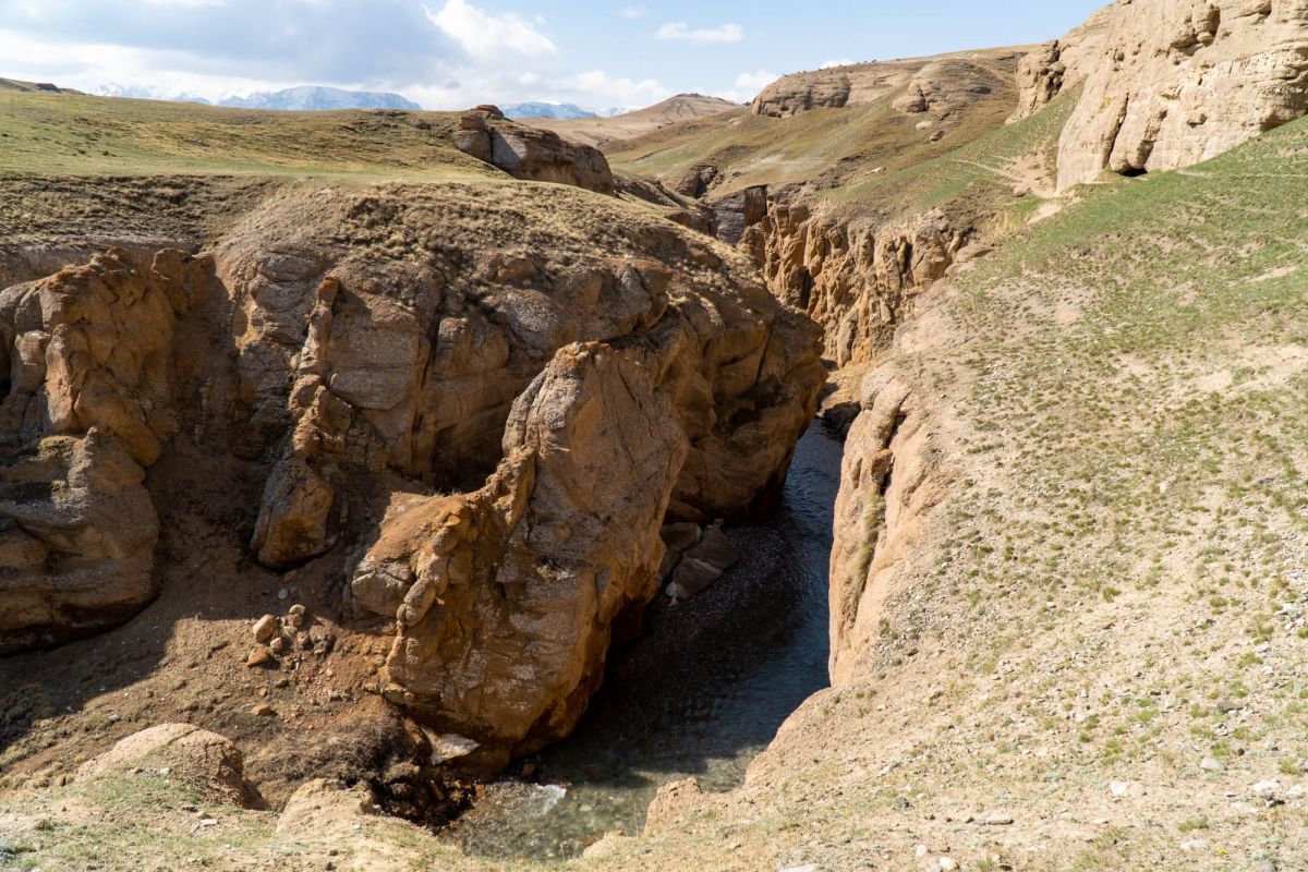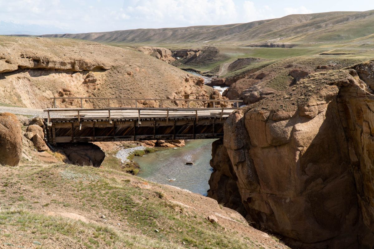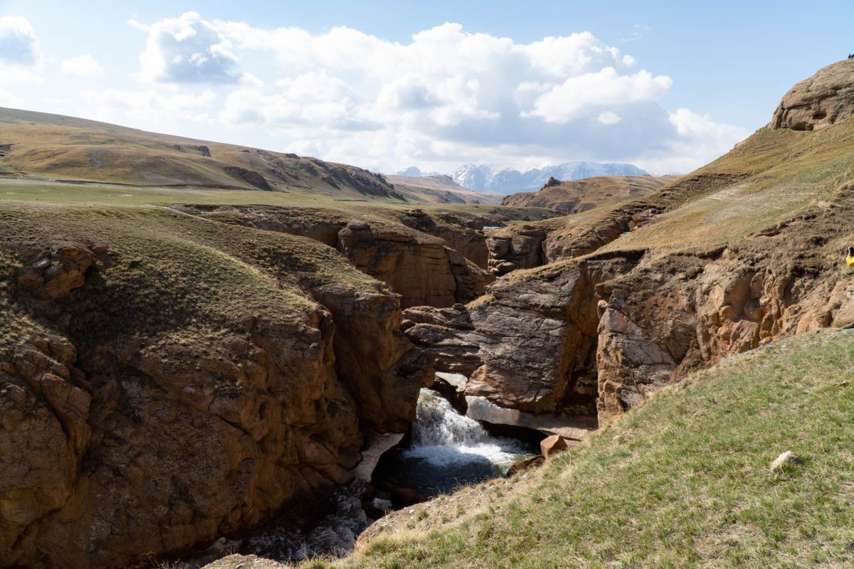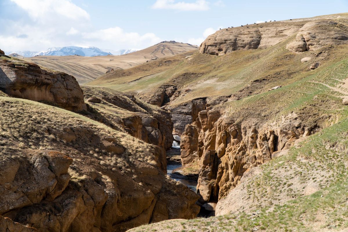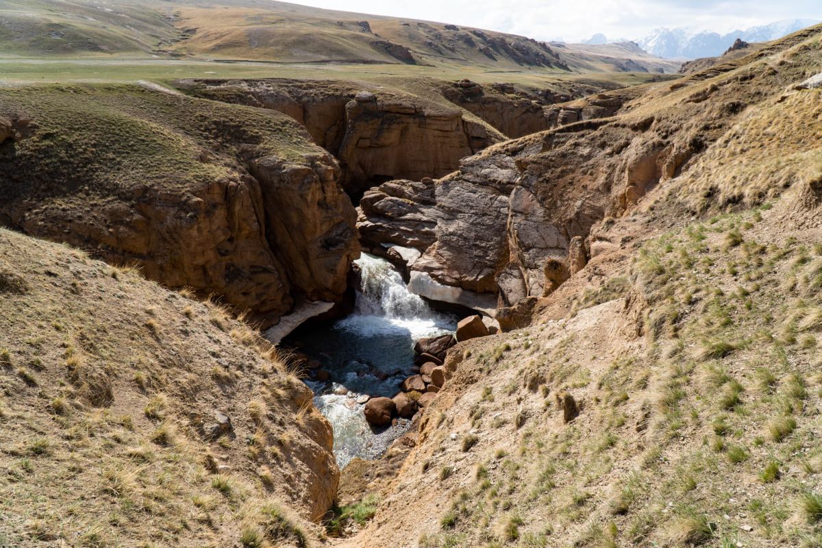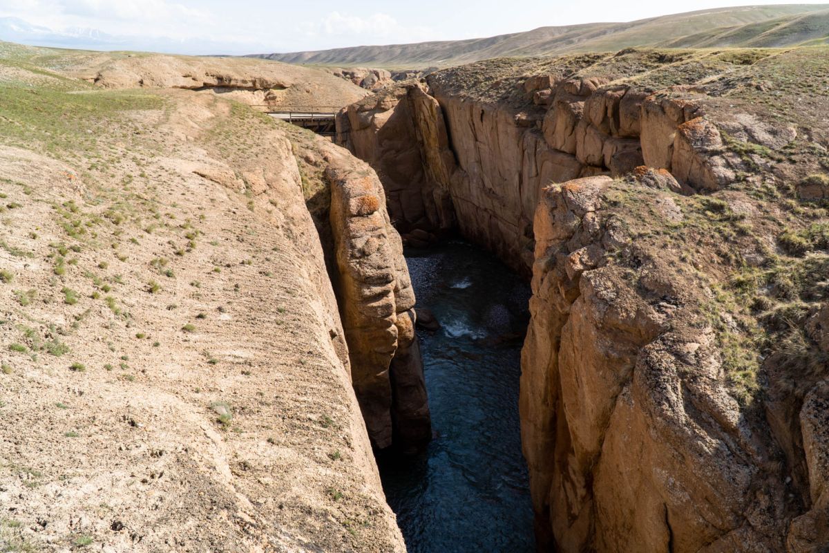 Аксайский каньон располагается неподалеку от озера Кель Суу и моста через реку Аксай, по направлению на север. Он рассекает долину в предгорьях Западного Тянь-Шаня глубоким извилистым шрамом, по дну которого несуться талые воды горных снегов, впадая впоследствии в широкий Аксай. Каньон пересекает небольшой деревянный мост, от которого следует продвинуться пешком в северную часть расщелины, чтобы полюбоваться наиболее выразительным отрезком эффектного ландшафта. Пороги на дне ущелья образует серию эффектных водопадов, бьющихся в теснине мощными и бурными потоками. В окрестностях, на зеленых покрывалах пастбищ можно встретить пасущихся овец и коз, также здесь обитают сурки и горные орлы.