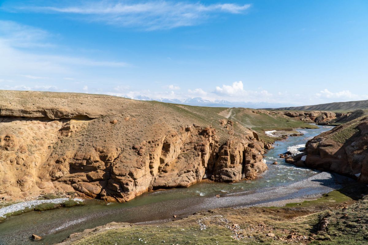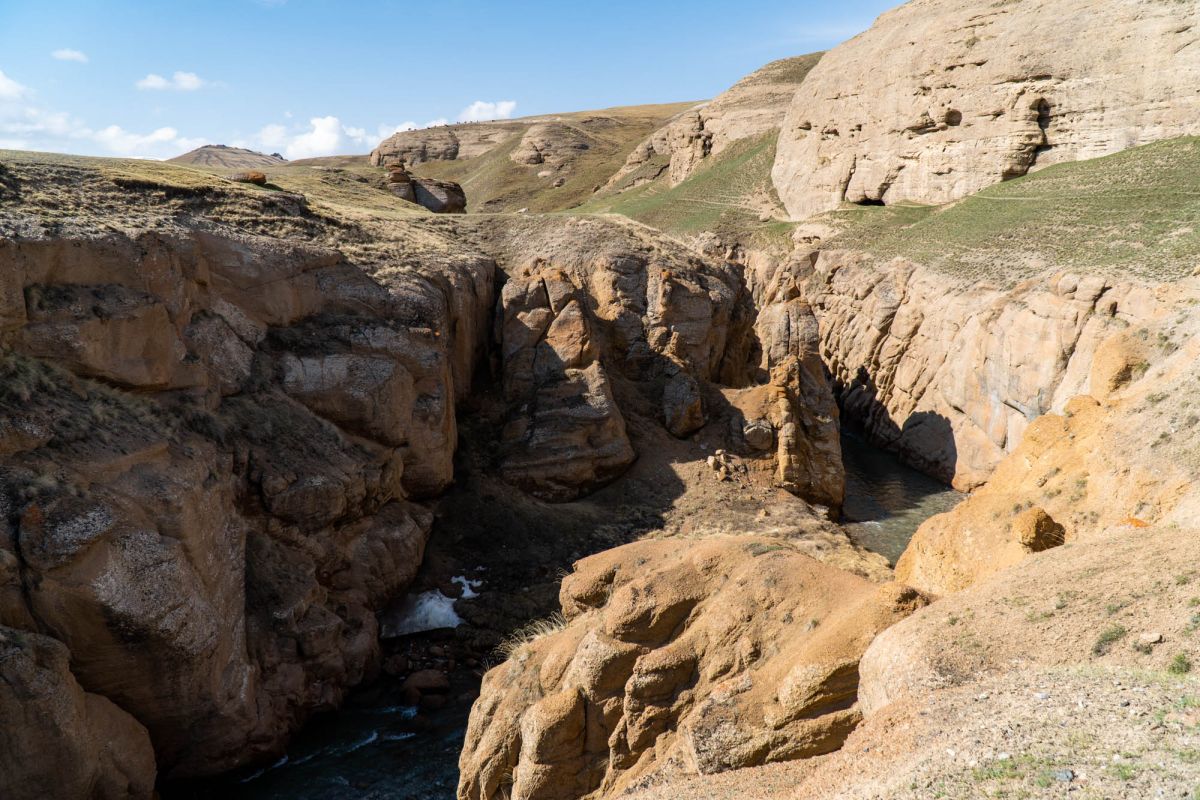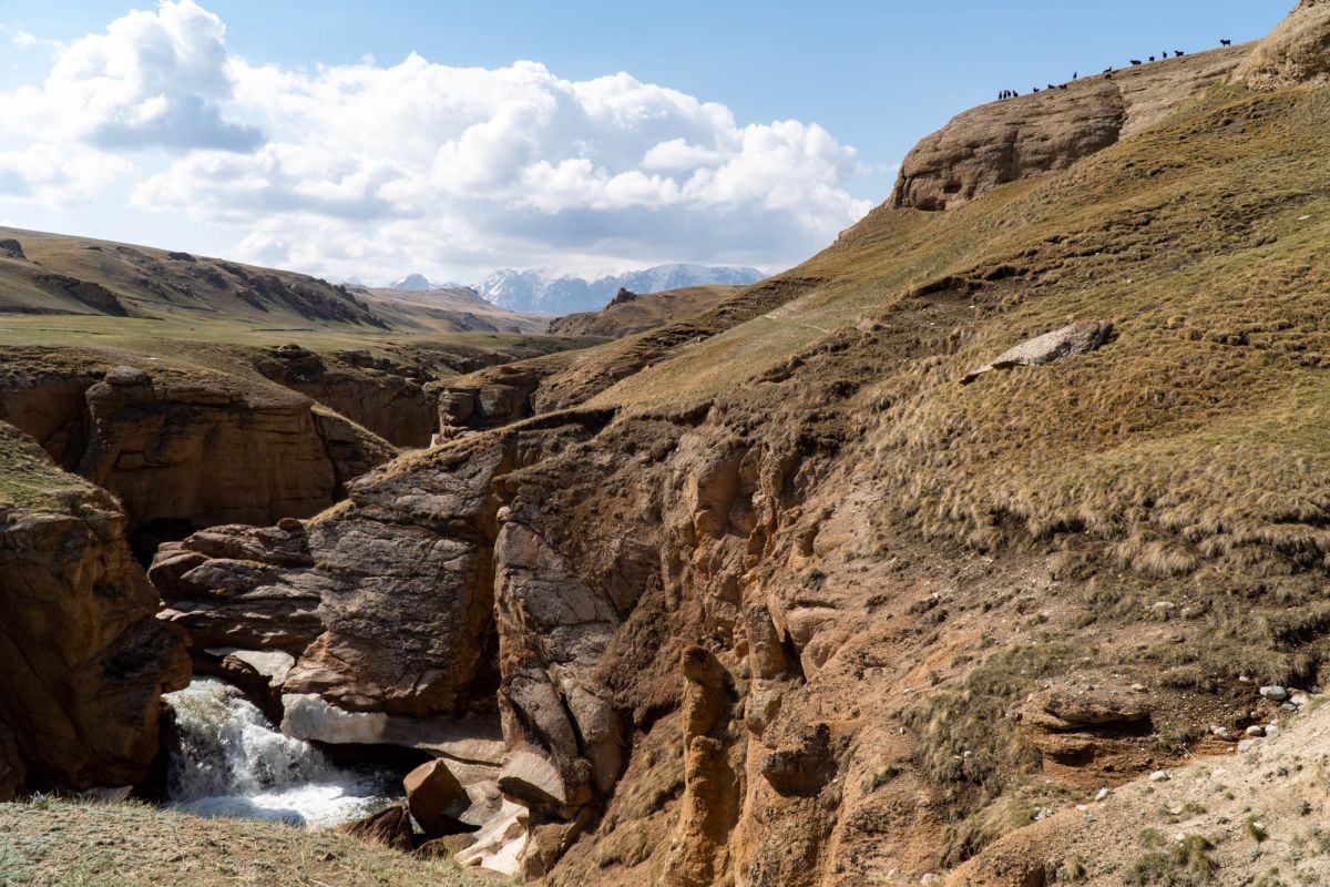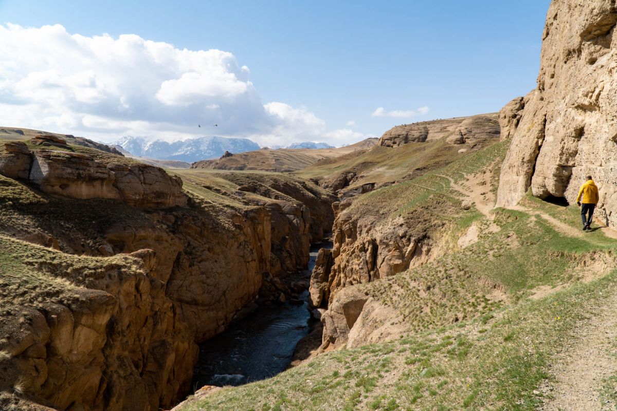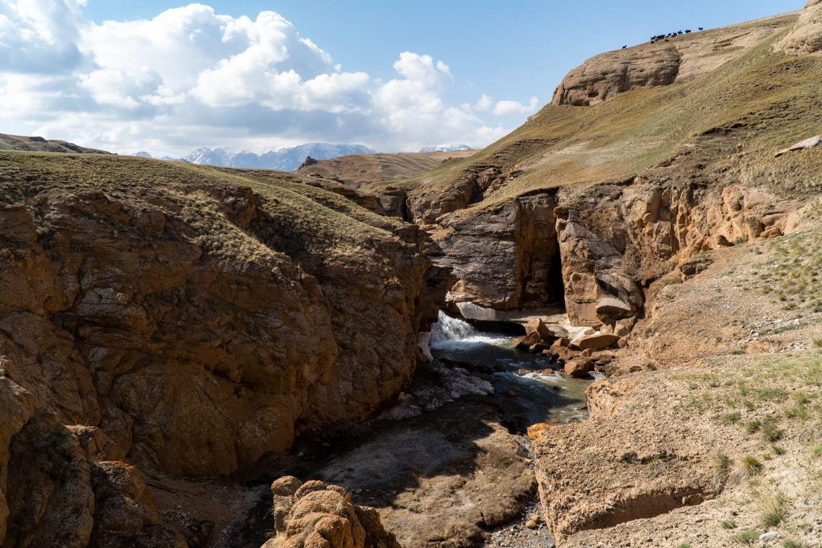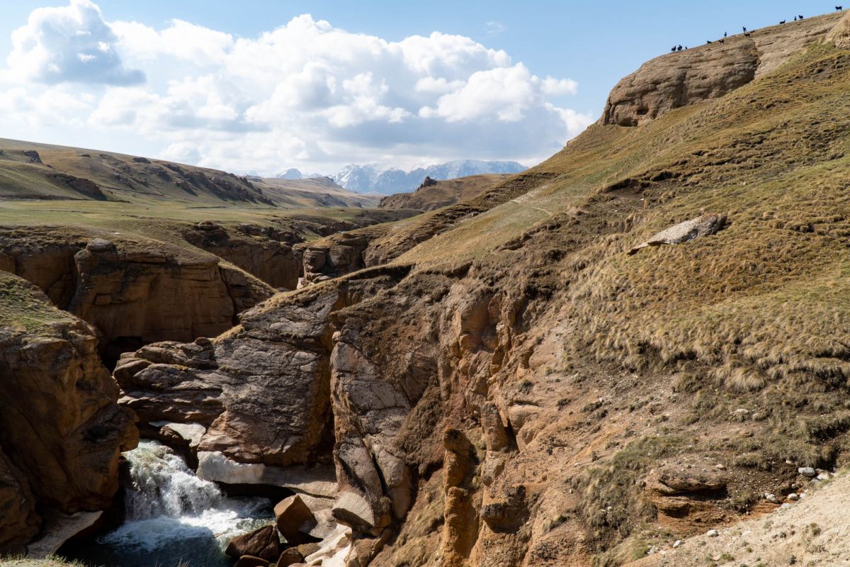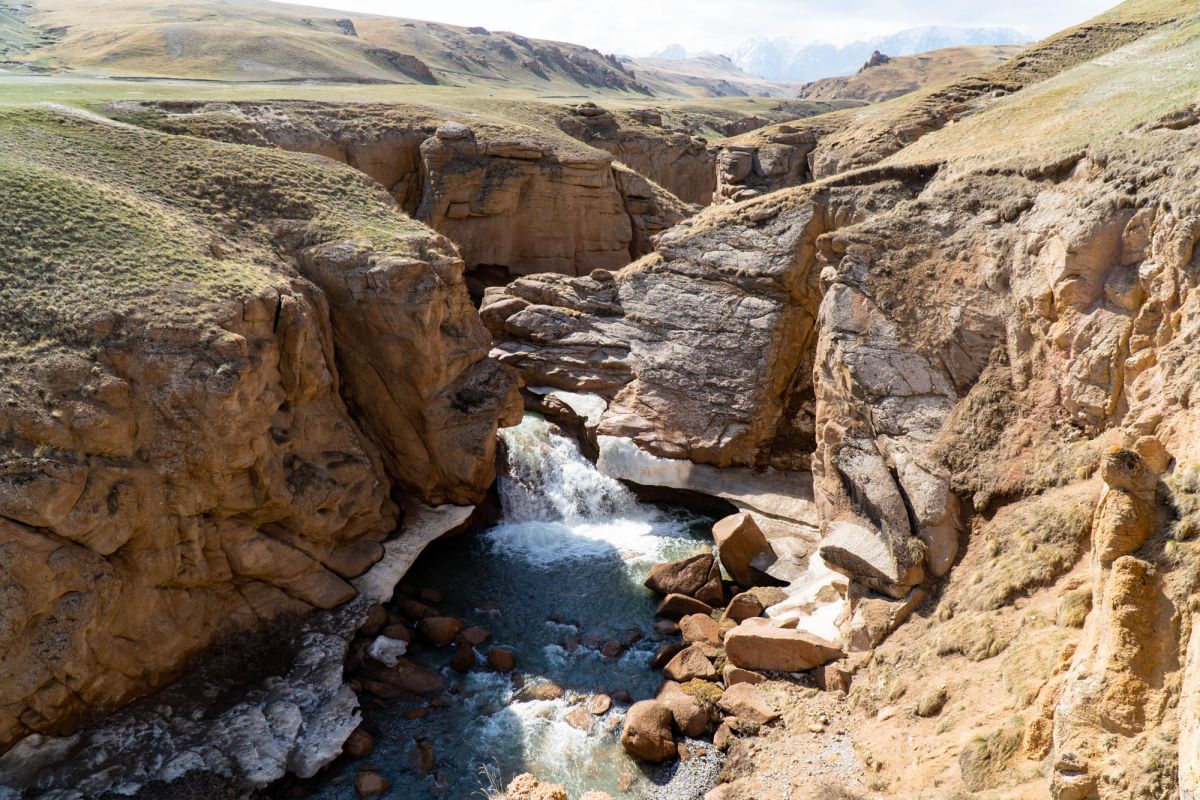 Аксайский каньон располагается неподалеку от озера Кель Суу и моста через реку Аксай, по направлению на север. Он рассекает долину в предгорьях Западного Тянь-Шаня глубоким извилистым шрамом, по дну которого несуться талые воды горных снегов, впадая впоследствии в широкий Аксай. Каньон пересекает небольшой деревянный мост, от которого следует продвинуться пешком в северную часть расщелины, чтобы полюбоваться наиболее выразительным отрезком эффектного ландшафта. Пороги на дне ущелья образует серию эффектных водопадов, бьющихся в теснине мощными и бурными потоками. В окрестностях, на зеленых покрывалах пастбищ можно встретить пасущихся овец и коз, также здесь обитают сурки и горные орлы.