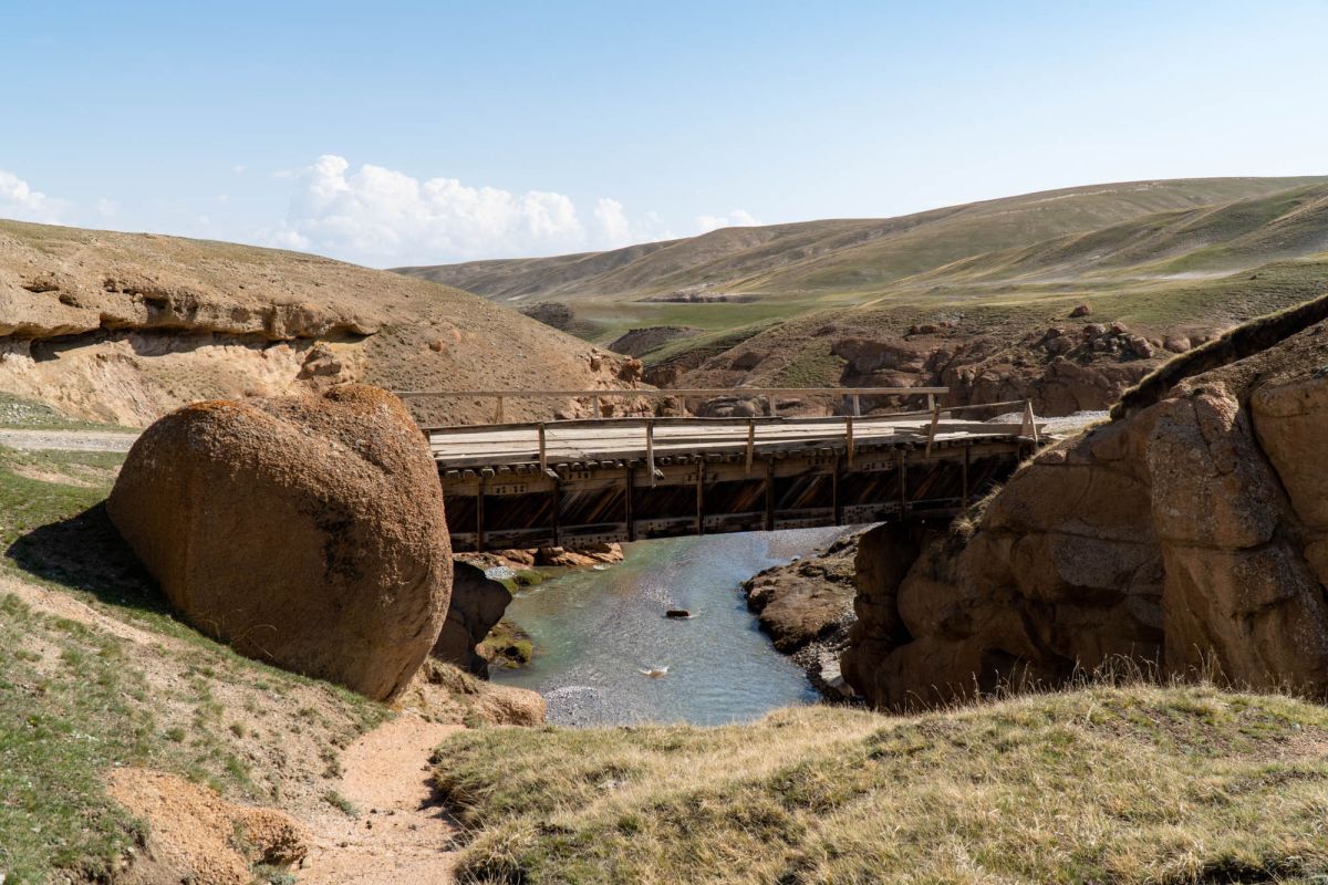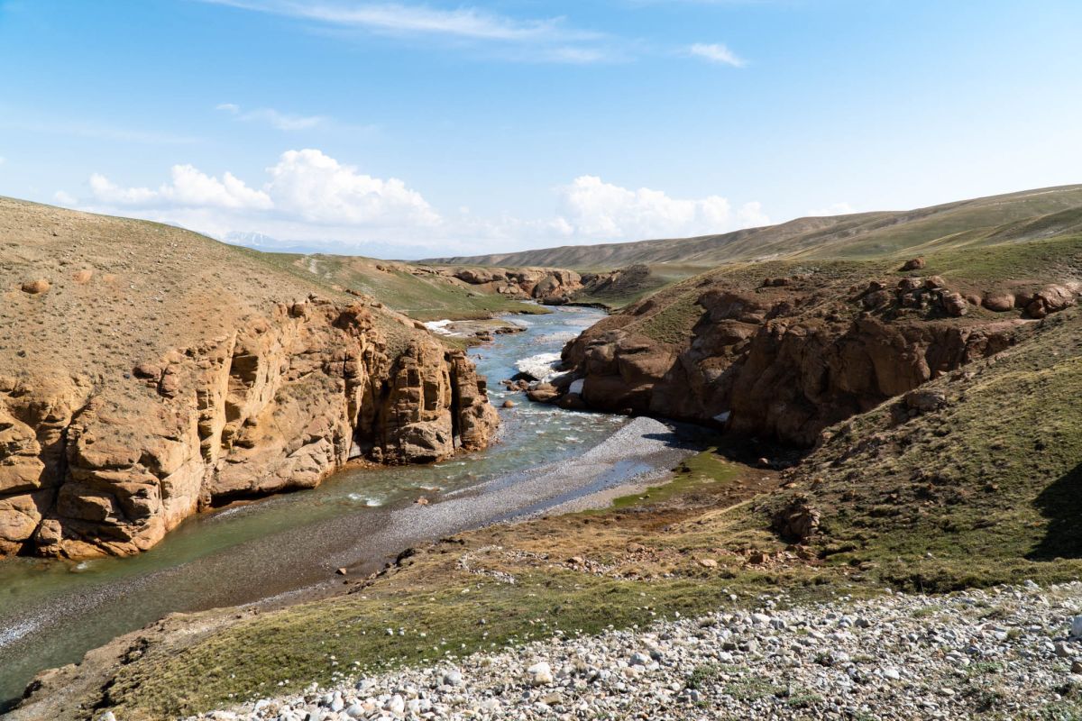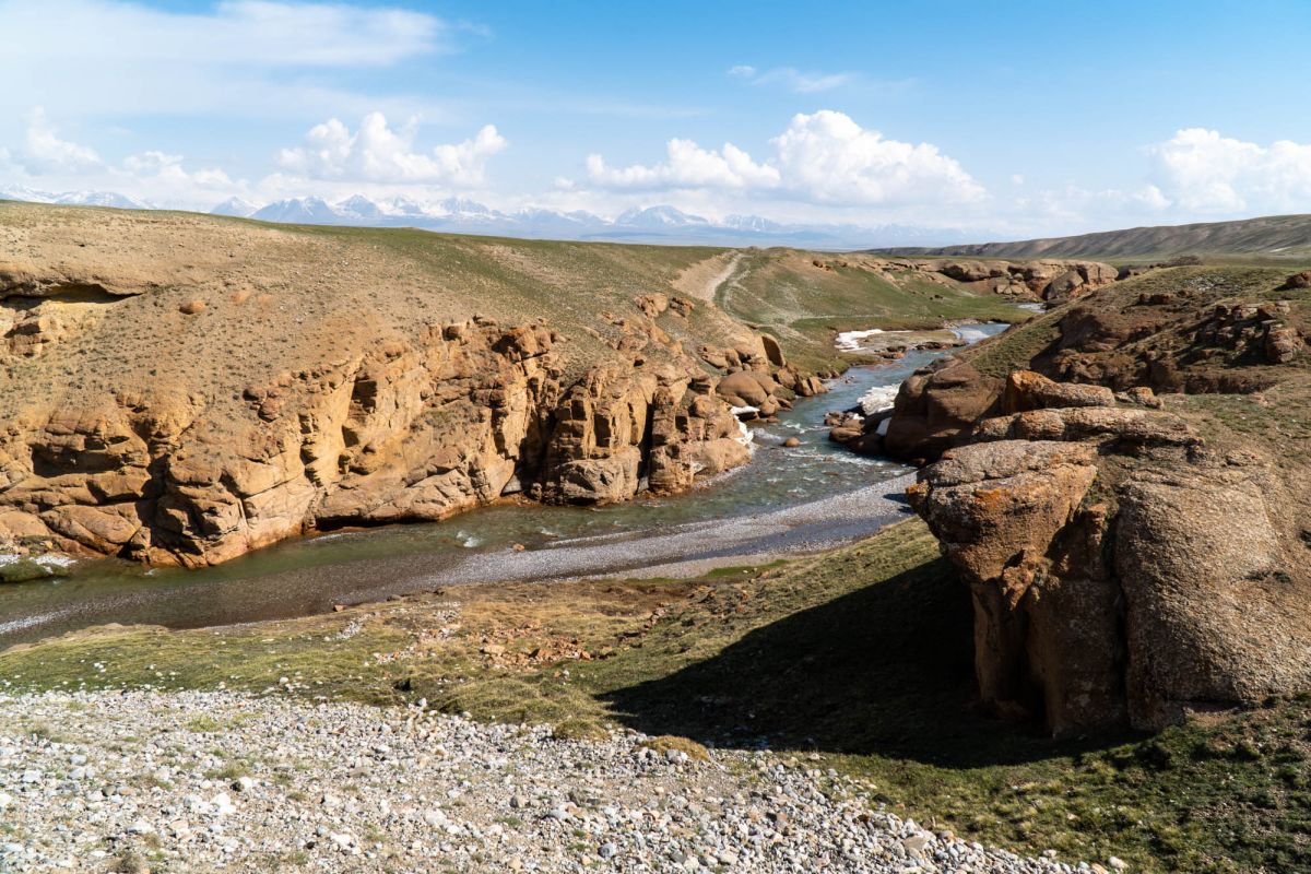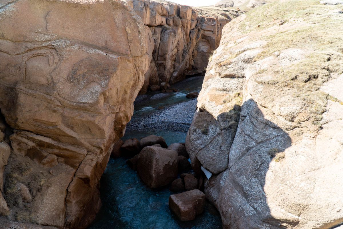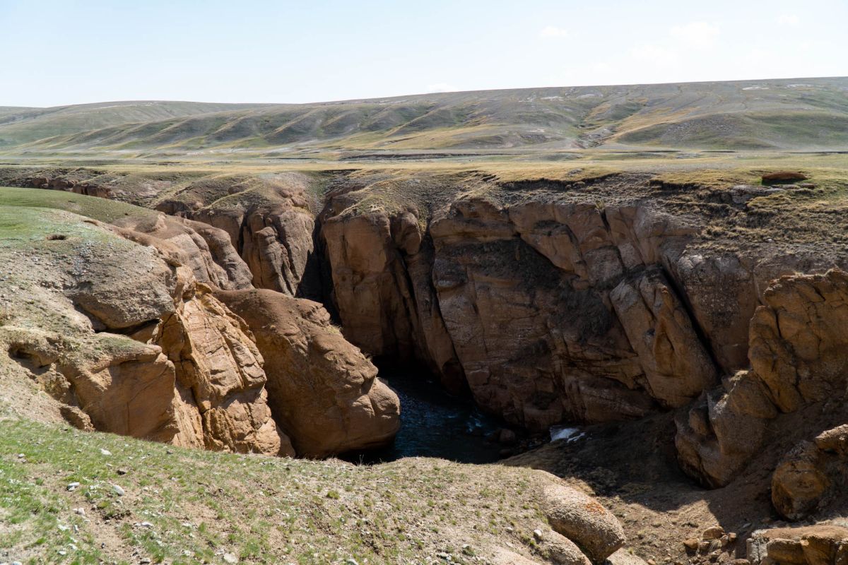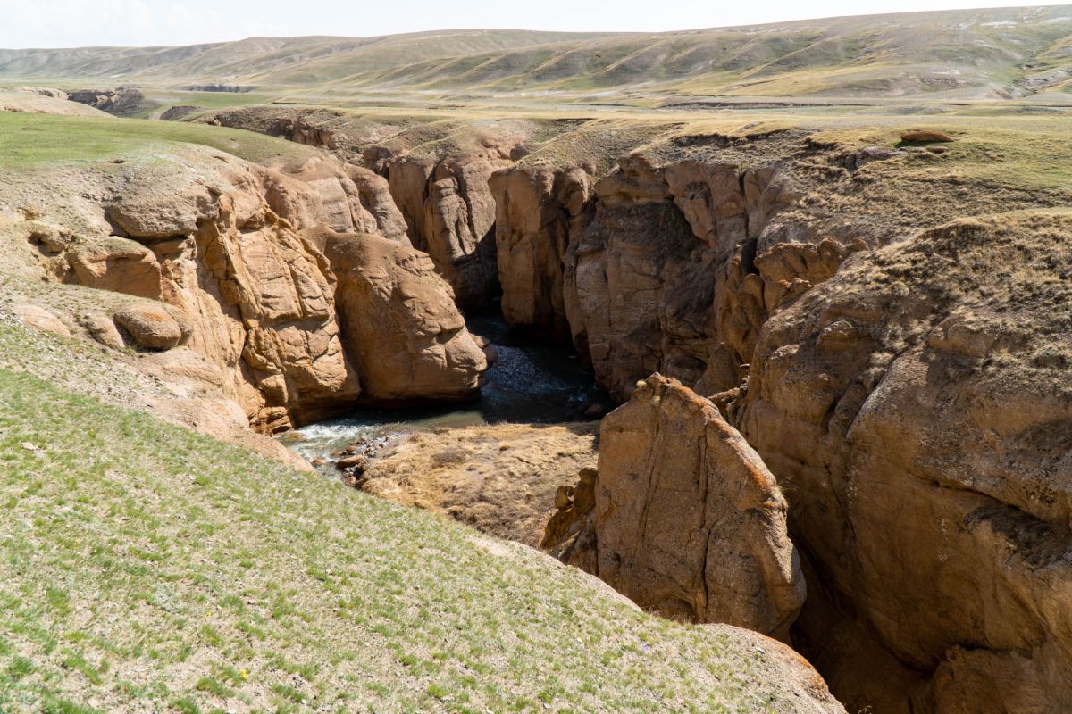 Аксайский каньон располагается неподалеку от озера Кель Суу и моста через реку Аксай, по направлению на север. Он рассекает долину в предгорьях Западного Тянь-Шаня глубоким извилистым шрамом, по дну которого несуться талые воды горных снегов, впадая впоследствии в широкий Аксай. Каньон пересекает небольшой деревянный мост, от которого следует продвинуться пешком в северную часть расщелины, чтобы полюбоваться наиболее выразительным отрезком эффектного ландшафта. Пороги на дне ущелья образует серию эффектных водопадов, бьющихся в теснине мощными и бурными потоками. В окрестностях, на зеленых покрывалах пастбищ можно встретить пасущихся овец и коз, также здесь обитают сурки и горные орлы.