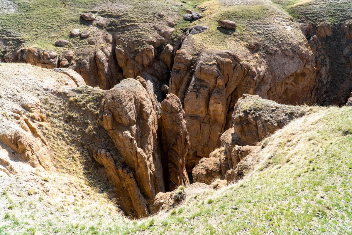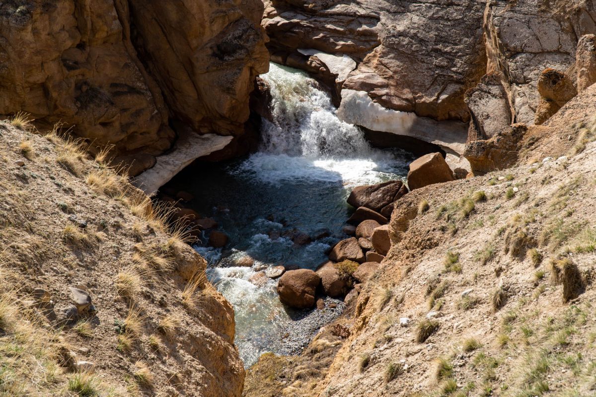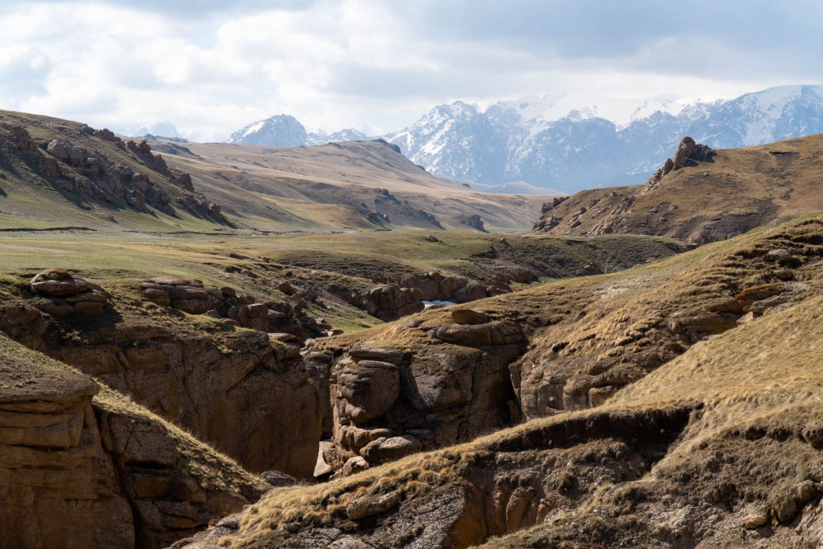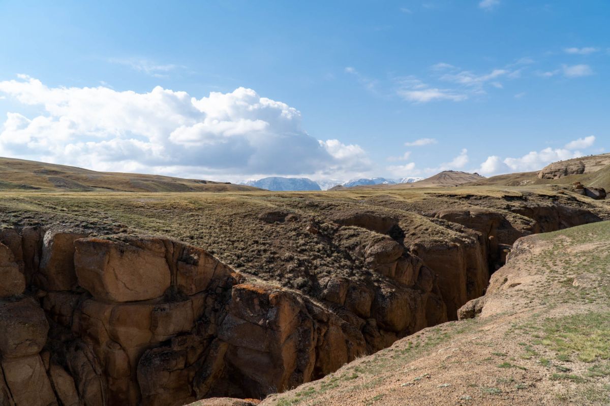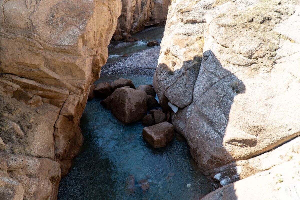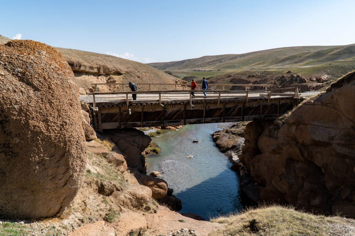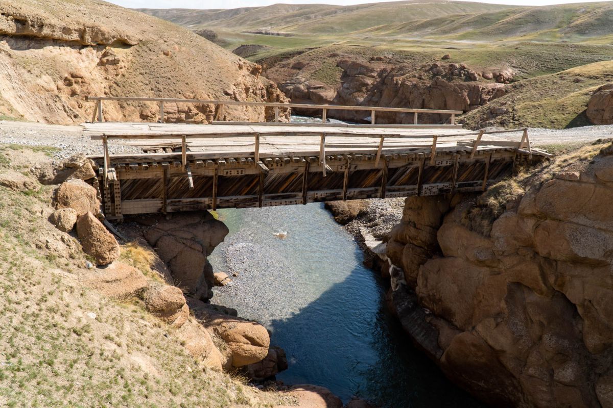 Аксайский каньон располагается неподалеку от озера Кель Суу и моста через реку Аксай, по направлению на север. Он рассекает долину в предгорьях Западного Тянь-Шаня глубоким извилистым шрамом, по дну которого несуться талые воды горных снегов, впадая впоследствии в широкий Аксай. Каньон пересекает небольшой деревянный мост, от которого следует продвинуться пешком в северную часть расщелины, чтобы полюбоваться наиболее выразительным отрезком эффектного ландшафта. Пороги на дне ущелья образует серию эффектных водопадов, бьющихся в теснине мощными и бурными потоками. В окрестностях, на зеленых покрывалах пастбищ можно встретить пасущихся овец и коз, также здесь обитают сурки и горные орлы.