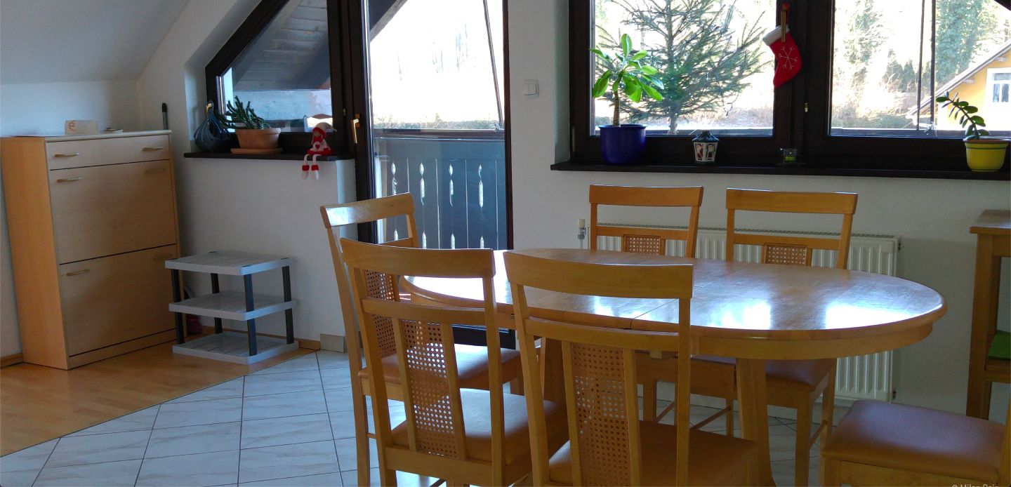 Апартамент расположен на верхнем этаже дома в непосредственной близости от озера Блед. Он имеет площадь 90 м² и может вместить 4 человека. Квартира состоит из большой гостиной с обеденной зоной, кухни, двух спален, ванной комнаты и балкона. Отсюда открывается великолепный вид на озеро Блед, Бледский замок и остров Блед. Квартира обеспечена всем необходимым кухонным оборудованием и мебелью для 4 человек. Постельное белье и полотенца включены в стоимость проживания. В квартире также есть кабельное телевидение и бесплатный Wi-Fi. Имеется парковка для гостей. В непосредственной близости от квартиры находится продуктовый магазин, ресторан, бесплатный пляж, автовокзал и остановка туристического поезда. Велосипеды и рыболовные снасти можно хранить в кладовке на первом этаже. Карта Bled предоставляется бесплатно.