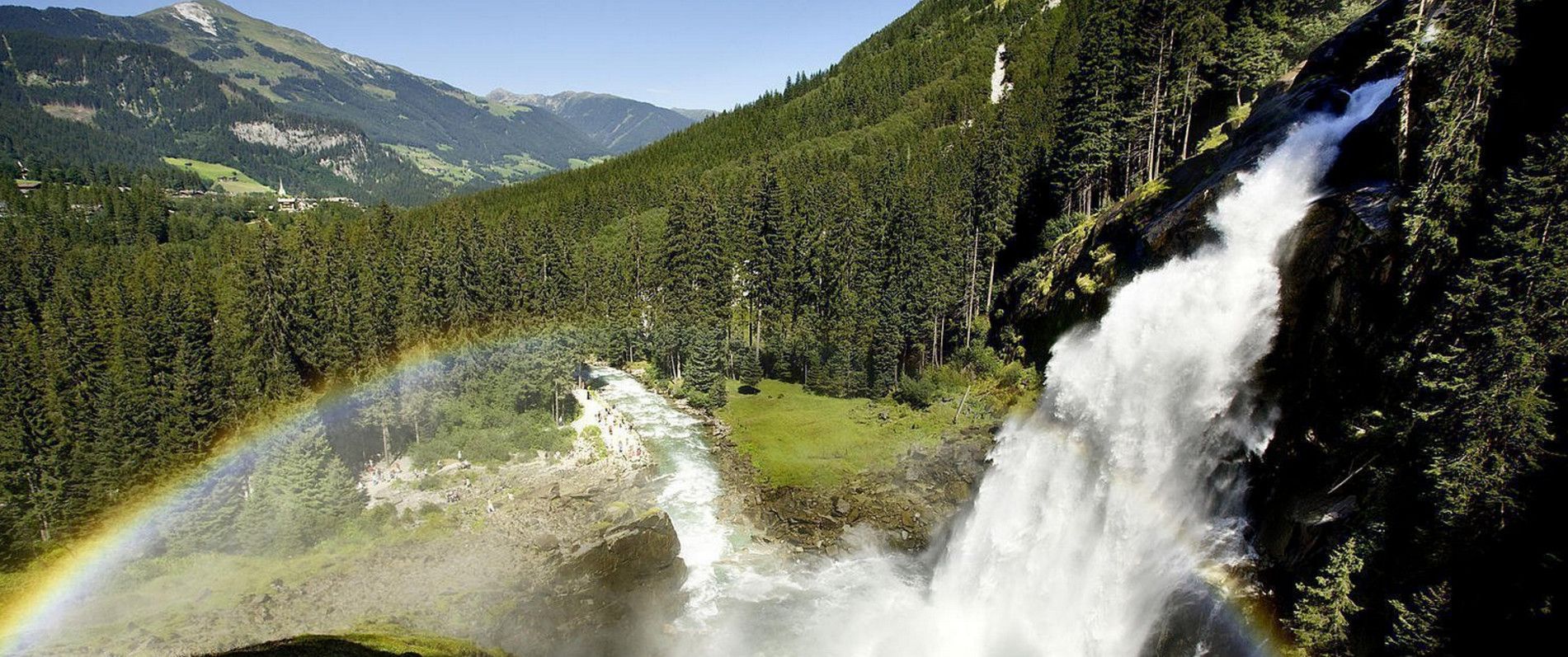 Водопады Кримль обязаны своему рождению реке Кримль (Krimml). Они расположены в окрестностях одноименной деревни, с населением 886 человек, на самом западе федеральной земли Зальцбург. Река начинается в конце долины Кримль Ачен, которую спокойно и мягко пересекает на протяжении 20 километров. Орошая своими ледниковыми водами многочисленные пастбища долины, река набирает силу, чтобы потом, как рычащий зверь, устремиться вниз. Кримльские водопады - одни из самых высоких каскадных водопадов в Европе — его суммарная высота составляет 380 метров. Не удивительно, что их называют «Ниагарой» Австрии. Водопады Кримль входят в десятку самых крупных водопадов в мире. Это один из самых посещаемых туристических объектов Австрии. Ежегодно, сюда приезжают более 4000 000 посетителей, для того, чтобы насладиться видами водопада, а также чтобы поправить свое здоровье. Воздух рядом с водопадами обладает уникальным лечебным эффектом. Обычный человек, в зависимости от своего местоположения, вдыхает кислород, заряженный от 300 до 3000 парами ионов на метр квадратный. В воздушном пространстве рядом с водопадами количество ионов увеличено до 70 000 пар, что благоприятно сказывается на слизистой оболочке дыхательных путей человека. Кроме того отрицательные ионы воздуха, циркулирующие в воздухе водопада, стимулируют иммунную систему, оказывают благоприятное воздействие на функцию легких и уменьшают частоту приступов у людей с аллергией и астмой. Здесь сделано все необходимое, чтобы любой желающий смог приехать и получить нужное количество аэротерапии. В инфраструктуре Климмльских водопадов продуманы все мелочи, начиная от отелей и коттеджей, в которых можно остановиться на ночлег, заканчивая многочисленными кафе и ресторанами на любой вкус и достаток. Здесь разработаны маршруты для людей с ограниченными возможностями, оборудованы автостоянки и туалеты. Безбарьерная зона проложена к самому низкому водопаду. Понимая уникальность данного объекта, подаренного природой, власти Австрии стремятся к его сохранению. Все денежные средства, собранные от посещения туристами Криммльских водопадов, идут на улучшение и содержание инфраструктуры туристических маршрутов, поддержание чистоты и порядка. Каскад состоит из трёх водопадов, из них верхний – наиболее впечатляющий - имеет высоту 140 метров. Низвергающиеся массы воды от 10 до 83 м3 в секунду (в зависимости от сезона года и времени суток), разбиваются на миллиарды брызг, поэтому воздух здесь постоянно влажный. Это создает благоприятные условия для роста многих видов редких мхов. Так, например, на серых камнях в расщелинах скал растет светящийся мох, обладающий способностью отражать свет. Кроме того, рядом с водопадами обитают около 62 видов птиц, девять из которых занесены в Красную книгу. Посетителям потребуется около 3,5 часов, чтобы изучить всю местность. После осмотра нижнего каскада можно посетить вторую ступень водопада, расположенную в 12 минутах ходьбы. К радости посетителей здесь работает специальное туристическое такси, которое за самое короткое время подымет посетителей на второй ярус. Ещё немного времени потребуется для того, чтобы добраться до третьей финальной ступени, чтобы иметь возможность охватить взглядом весь мощный поток. С верхней точки разрешено подняться еще выше, практически к самому л