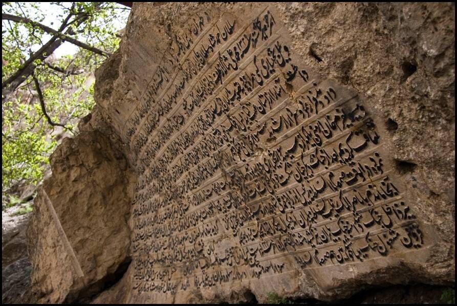 Эти надписи, расположенные на скале у подножия горы Загрос, были написаны насталиком, а в некоторых местах на шекасте насталик (буквально означает «сломанный насталик»), описывая битвы командиров бахтиари и племен против диктатуры Мохаммеда Али Шаха.