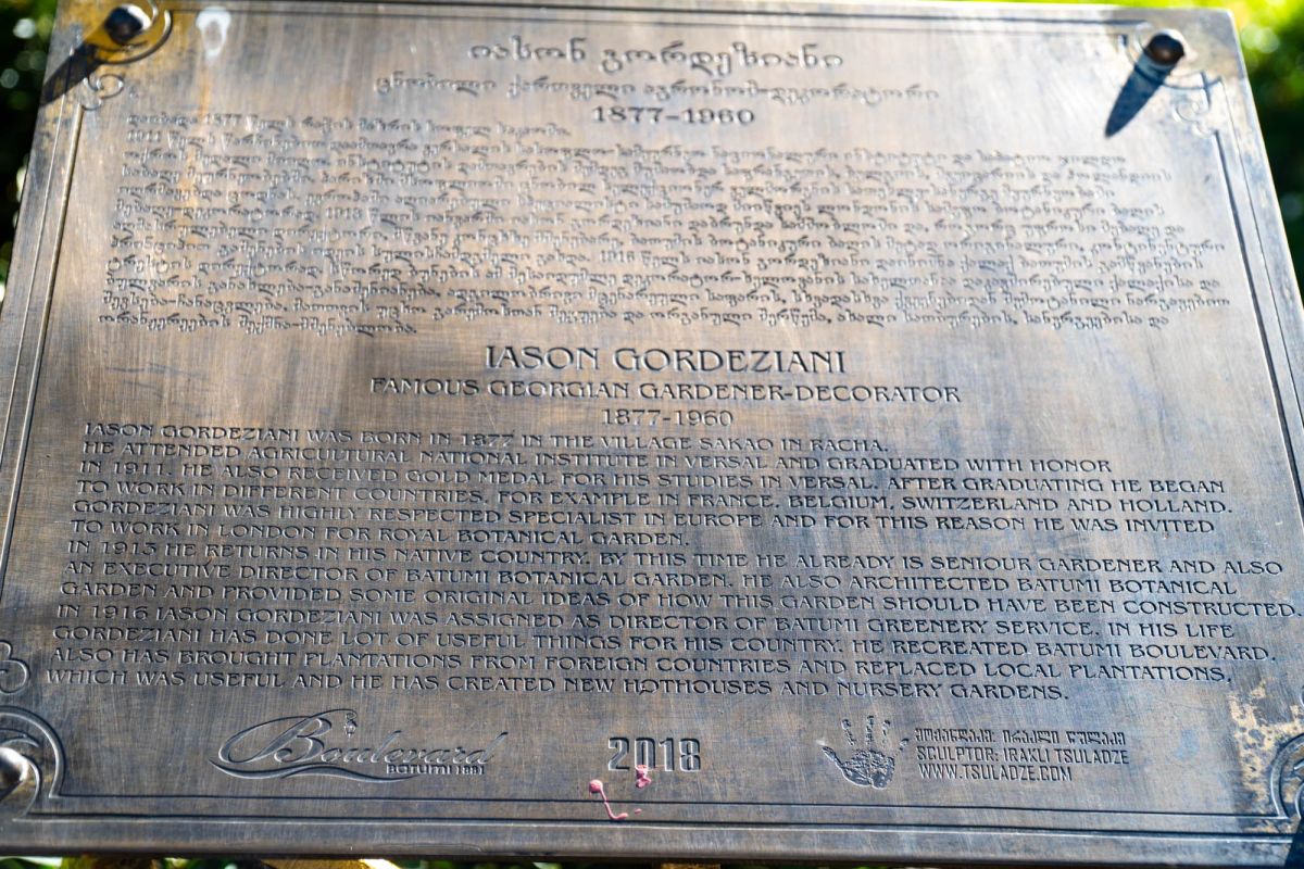 Памятник Ясону Гордезиани в Батуми посвящён выдающемуся грузинскому агроному, чья работа оказала огромное влияние на развитие сельского хозяйства и садово-паркового искусства в регионе. Этот памятник расположен рядом с ландшафтным парком, который служит живым воплощением идей Гордезиани, подчёркивая его вклад в благоустройство и озеленение города.