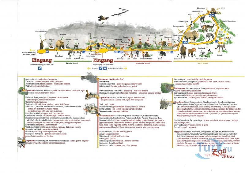 Зоопарк Зальцбурга является домом для 140 видов животных со всего мира. Родные и экзотические виды - от альпийского козерога до ленточного мангуста - живут на территории около 14 акров. Если вы хотите наблюдать за своими любимыми животными как можно чаще, то вам необходимо приобрести ежегодный абонемент, который обойдется для взрослого человека – 30 евро, для молодежи (15-19 лет) – 20 евро, для детей (4-14 лет) – 15 евро. По данному абонементу можно посещать зоопарк 365 дней в году. Уникальный ландшафт местечка Brunnersberg с крутой скальной стеной на одной стороне, и с предгорьями в пойме, с другой стороны, является домом для около 1200 диких животных в зоопарке Зальцбурга. В зоопарке продуманы все условия для отдыха, сюда можно придти как семьей, так и с домашними любимцами. Собакам рады в зоопарке Зальцбурга в любое время. Единственное условие – это приводить своих питомцев на коротком поводке. Все дороги в зоопарке гравийные, расположены, практически на одном уровне. Это сделано для беспрепятственного передвижения людей с ограниченными возможностями. Если же Вам понадобиться помощь, администрация зоопарка с удовольствием Вам поможет. Кормление животных в зоопарке строго запрещено. Так как неконтролируемое кормление вредит животным и может даже привести к их гибели. Кормление возможно только домашних животных зоопарка. Корм можно купить в зоопарке. Каждую пятницу и субботу в августе работает ночной зоопарк (вход в 21.00). В зоопарке работает ресторан, где можно выпить чашечку кофе, либо пообедать с семьей. Сувенирный магазин зоопарка предлагает своим посетителям предметы первой необходимости, а так же сувенирную продукцию.
