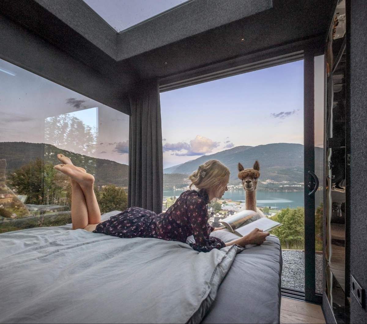 Стоимость ночлега в стеклянных домах с альпаками на улице составляет 3900 крон за ночь на двоих.