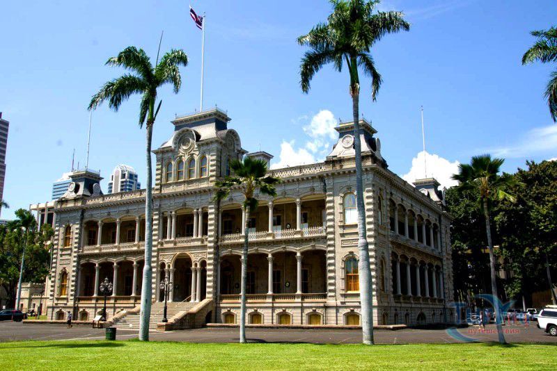 Дворец Иолани (Iolani Palace) расположен на острове Оаху, в исторической части города Гонолулу - столицы штата Гавайи. Дворец Иолани находится по соседству с Капитолием Гавайев Hawaii State Capitol. 2-х этажный дворец Iolani Palace с 4-х этажной башней по центру здания - это бывшая резиденция гавайских монархов Калакауа и Лилиуокалани в центре Гонолулу. Дворец Иолани (Iolani Palace) - это единственный королевский дворец на территории США. Слово «Иолани» переводится с гавайского языка как «небесный ястреб». Строительство Дворца велось под управлением архитектора Исаака Мура. Открытие Дворца Иолани состоялось в 1882 году и длительное время в нем находились власти острова — сначала он использовался в качестве резиденции монархов, а затем как место размещения гавайского правительства. Только в 1978 году Дворец Иолани, занимающий вместе с прилегающей к нему парковой территорией площадь в 4 гектара, распахнул свои двери для туристов в качестве музея. В Дворце Иолани сохранились библиотека, драгоценности, предметы быта и спальня королевы Лилиуокалани, которая была заточена здесь после второго восстания Вилкокса. Перед Дворцом красуется памятник королю Камеамеа.