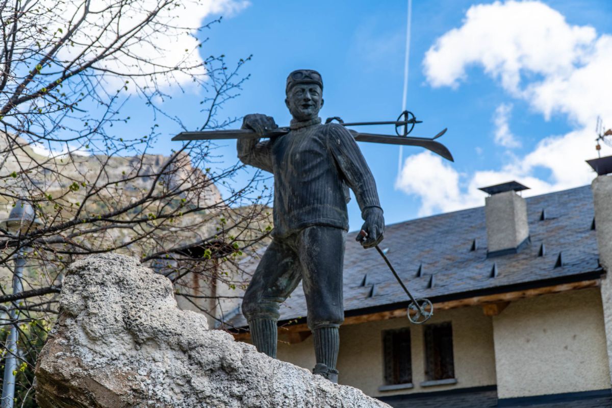 Скульптура изображает лыжника, одетого в типичную одежду начала 20 века: лыжи, очки, свитер и т. д., и для большей привлекательности имитирует ходьбу по снежному леднику.