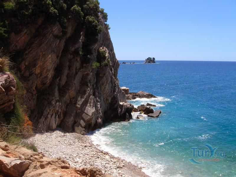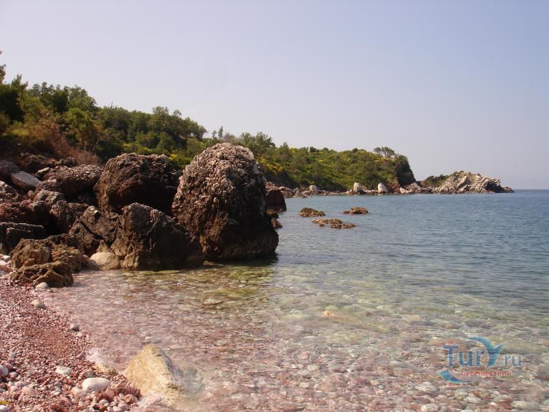 Пляжи отличаются тем, что имеют красноватый оттенок. Позади пляжа находится лес и скалы.