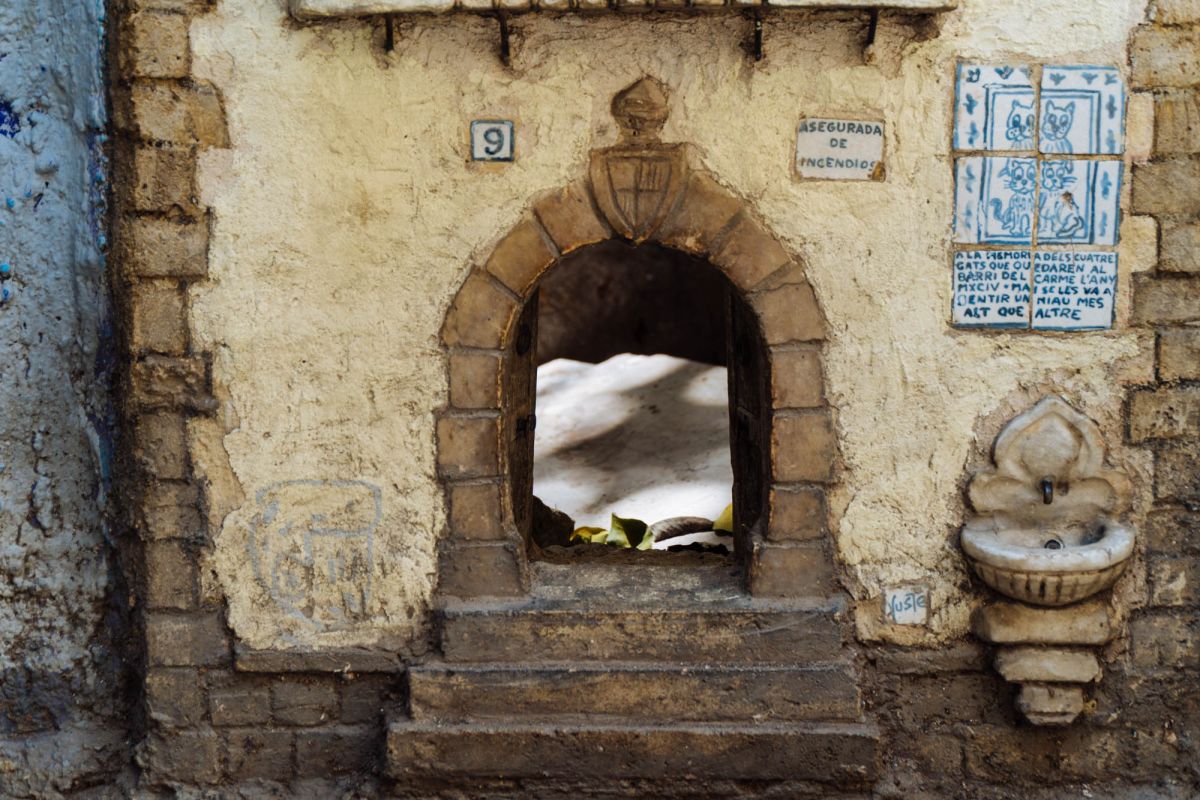 У подножия синей стены на Carrer del Museu фасад крошечного дома привлекает внимание прохожих. Дом высотой всего один или два фута, но он выполнен в классическом валенсийском стиле. У него испанская черепичная крыша, небольшой фонтан и «сад» сбоку (на самом деле всего одно растение в горшке).