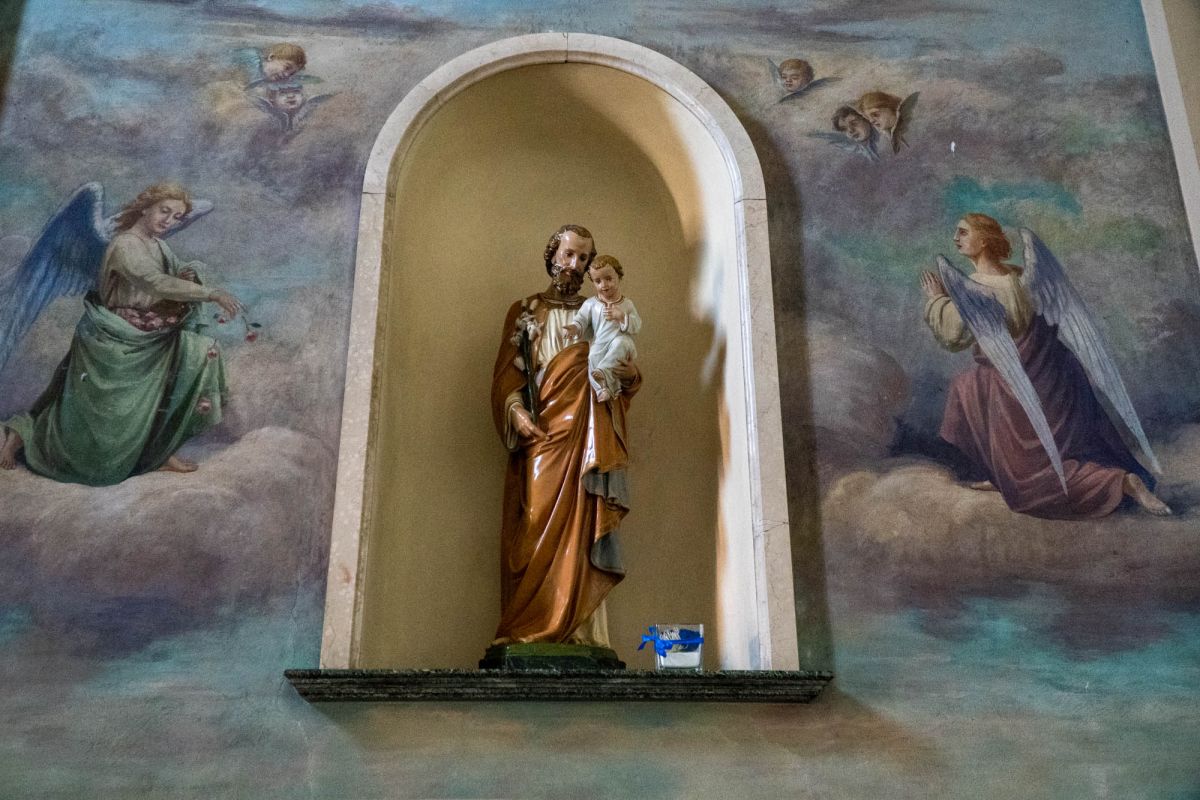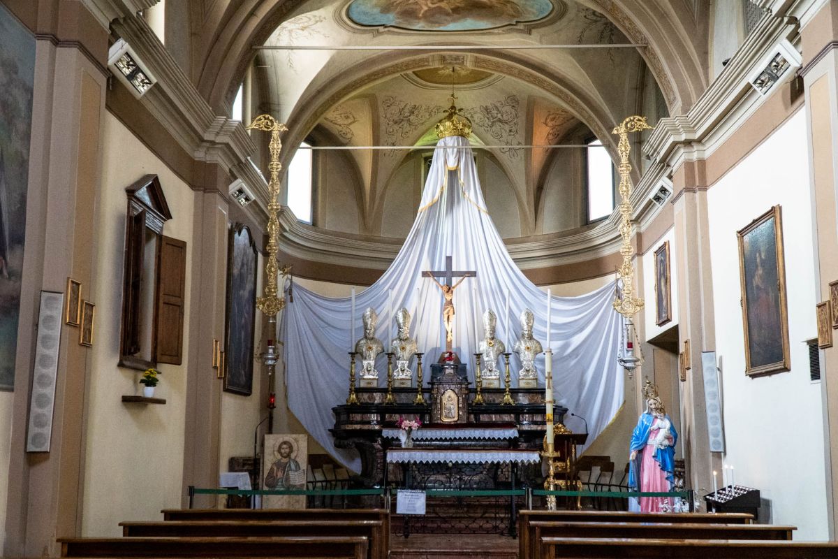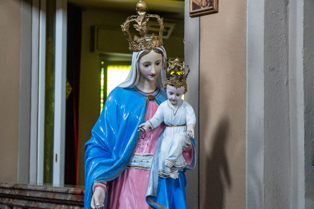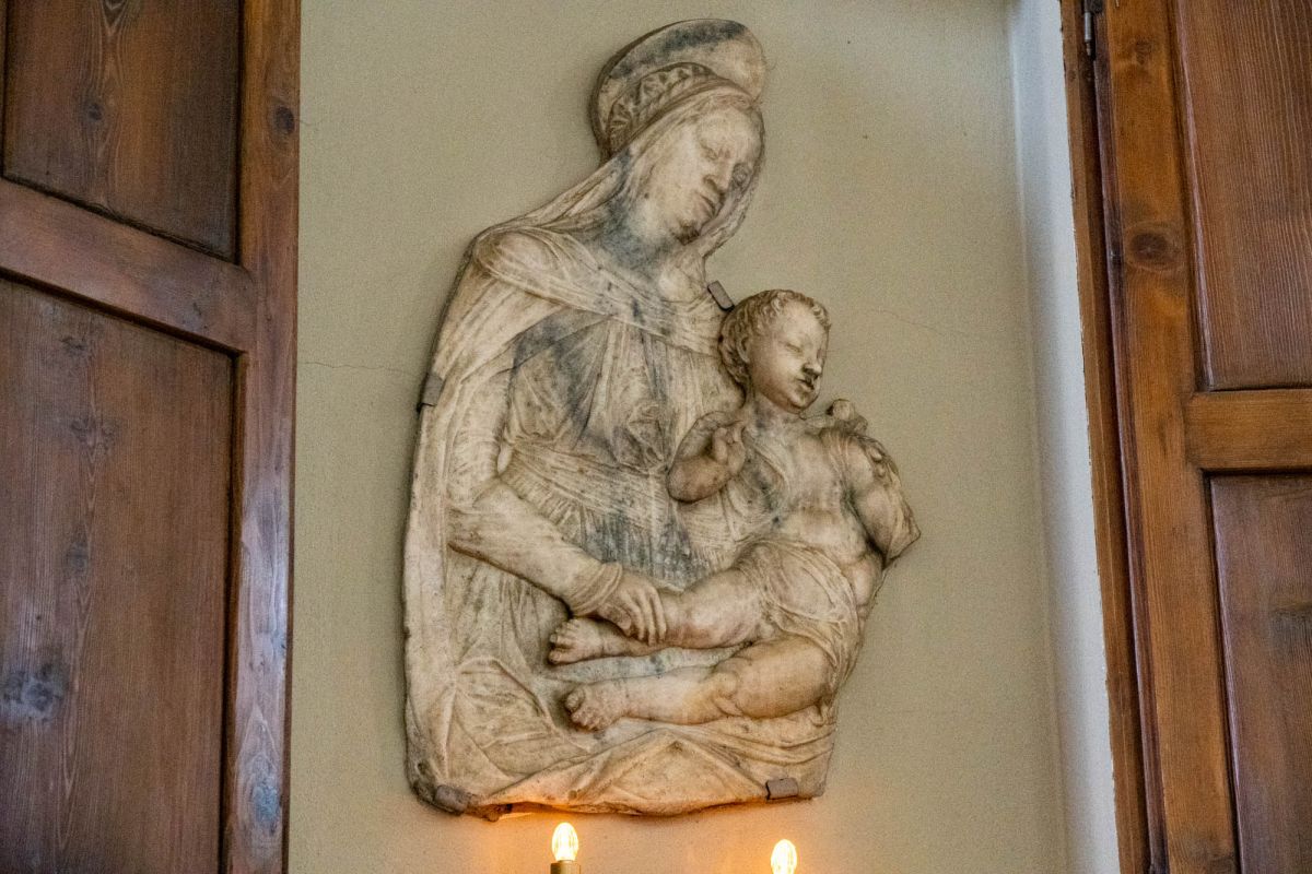 На левой стене – барельеф с изображением Девы Марии с Иисусом на руках – барельеф из часовни, разрушенной французами после битвы при Торнавенто (1636 г.) и найденной жителями села в девятнадцатом веке, который они вернули вместе с люнетом, изображающим святого Георгия, побеждающего дракона, помещенным позади церкви.