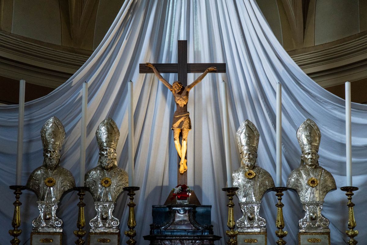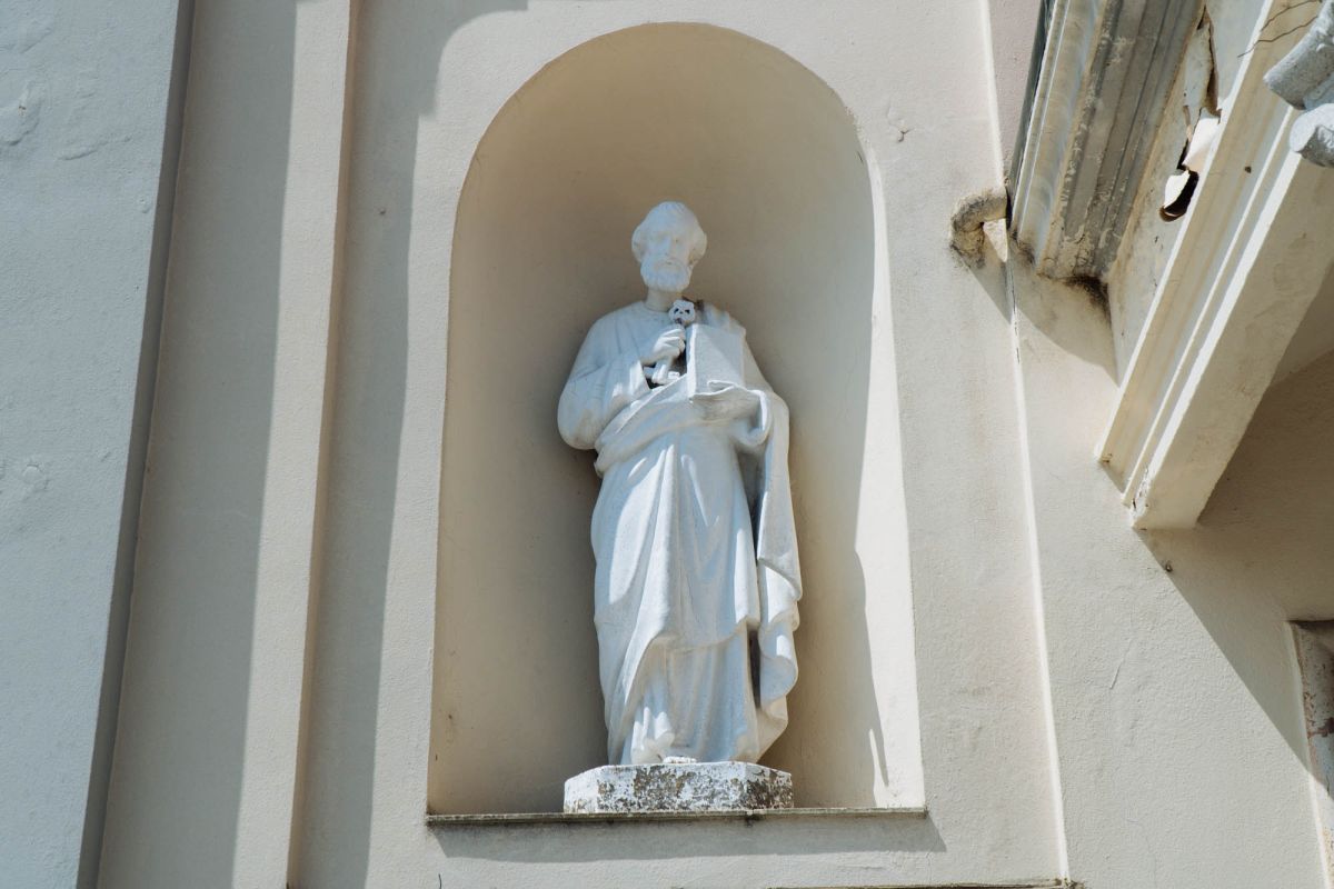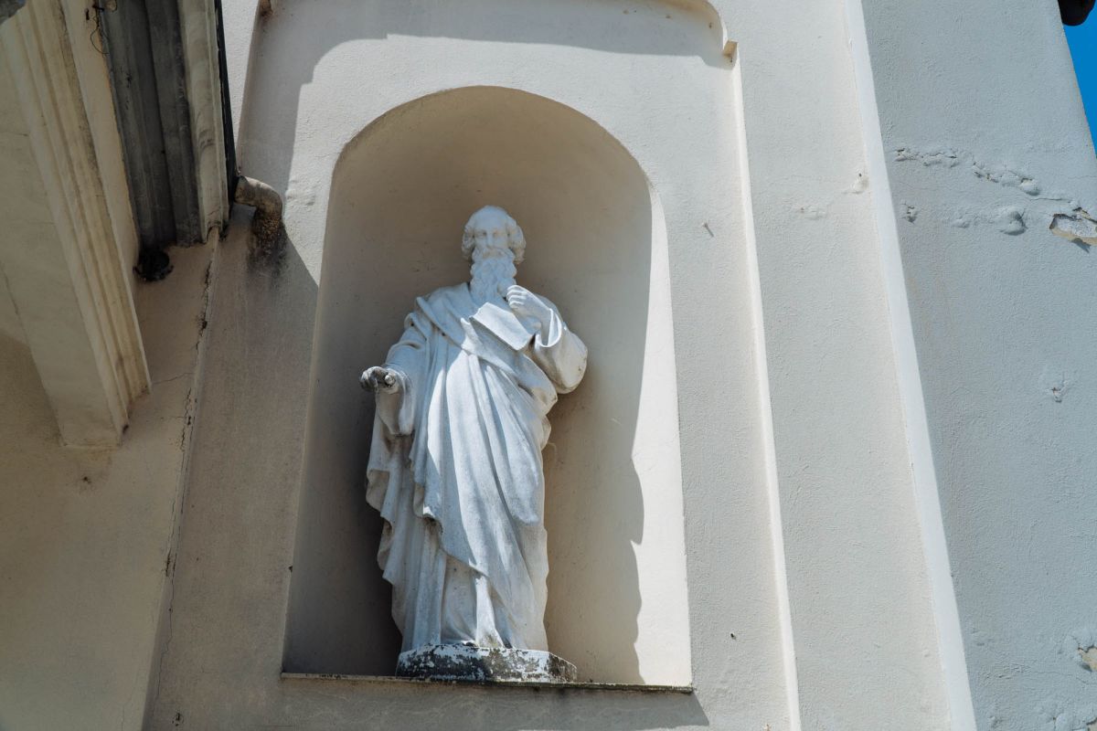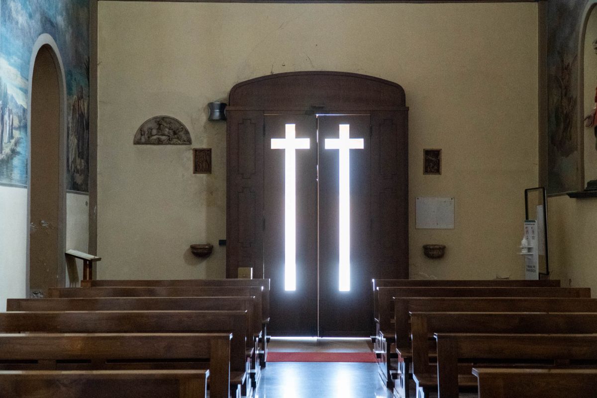 На левой стене – барельеф с изображением Девы Марии с Иисусом на руках – барельеф из часовни, разрушенной французами после битвы при Торнавенто (1636 г.) и найденной жителями села в девятнадцатом веке, который они вернули вместе с люнетом, изображающим святого Георгия, побеждающего дракона, помещенным позади церкви.