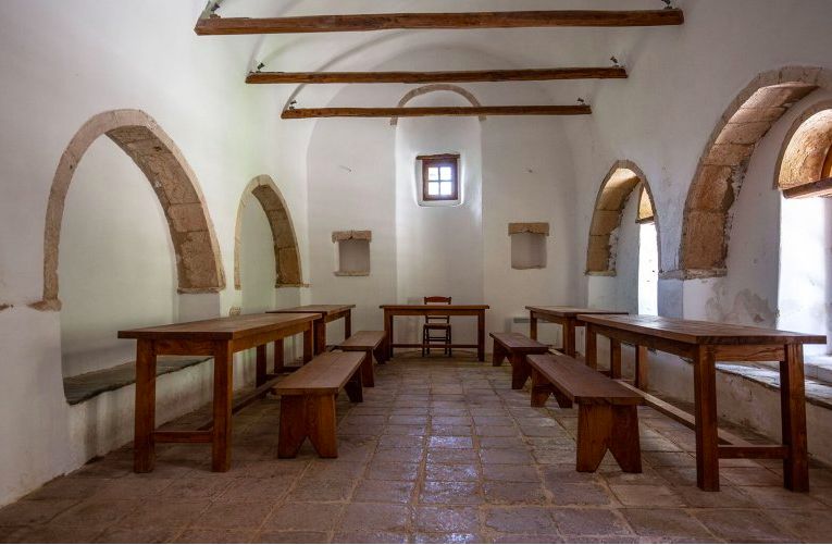 Обнесенный высокими стенами с востока и запада, монастырь соединен булыжными дорожками, или кальдеримиями, ведущими в ухоженный лес.