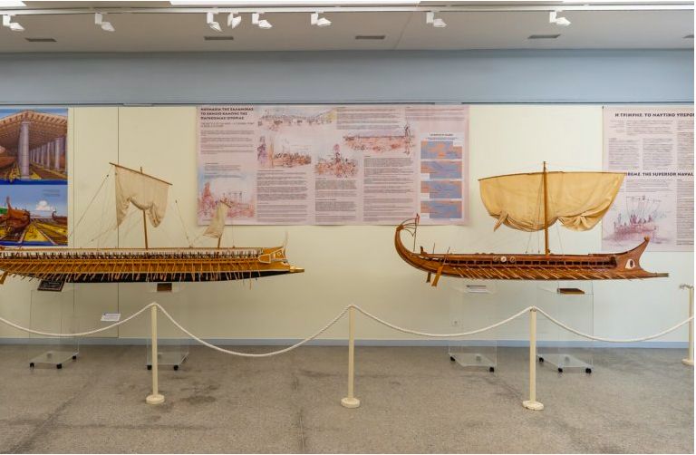 Выставка об укреплении гавани Фемистоклом в V веке до н.э. и значении триер и корабельных навесов в эту эпоху (есть отличное видео, иллюстрирующее это).