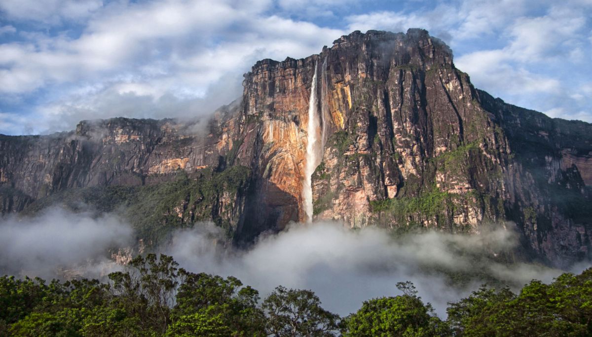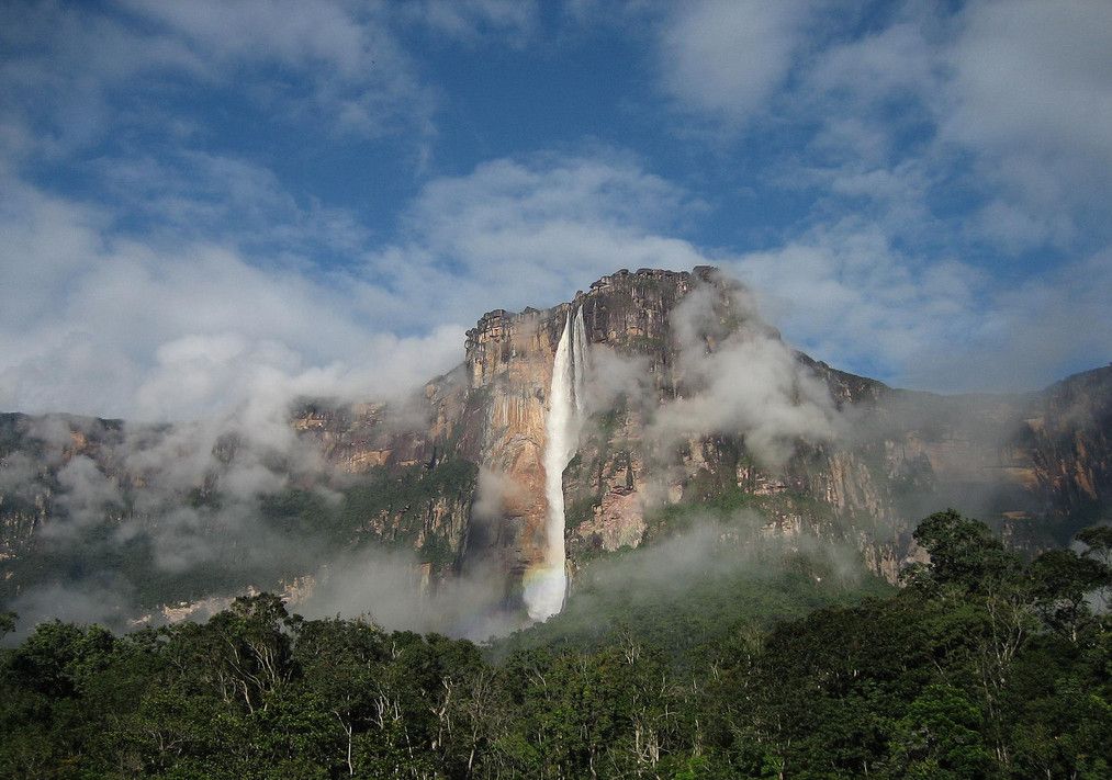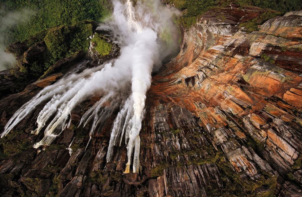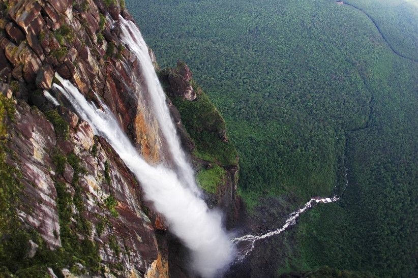 Самый высокий водопад на планете. Гигант 1-й величины носит имя его первооткрывателя - венесуэльского летчика Хуана Анхеля, индейцы же называли водопад Апемей или Девичья бровь. Невероятная восота падения воды - первый прыжок от обрыва до первого препятствия - 807 метров и второй - 172 до озера в джунглях, что в сумме состоавляет - 979 метров!!! Водопад Анхель находится на Юго-Востоке Венесуэлы - это довольно глухое место, доступное ранее исключительно настойчивым исследователям, теперь же попасть туда не сложно. Первый путь - по реке из Пуэрто-Ордас на Ориноко составляет примерно 240 км; и второй путь - полет из Эльдорадо и Санта-Элены - около 120 и 240 км. Для туристов наиболее приемлеиыми видами транспорта станут - каноэ с мотором или на небольшой легкий самолет. Для любителей острых ощущенй существует невеятная возможность, которую нельзя пропустить - прыжок с плато на дельтоплане. местные племена индейцев знают этот водопад под названием - Чурун-Меру, а плато называют - Ауян-Тепуи, что обозначает "Горы Дьявола". Это название полностью оправдывает себя, когда горы покрываются густым туманом. Издалека моно увидеть тонкую белаую полоску, которая начинается у края обрыва и постепенно превращаетя в невероятную струю брызг и водную пыль. В дождливую погоду этот царственный водопад окружает огромное количество более мелких струек воды, вырывающихся под обрывом из трещин в песчанике. Это зрелище одновременно невероятно величественное и элегантное в своей простоте, достойное звания высочайшего водопада мира.