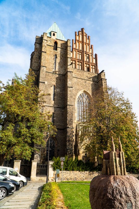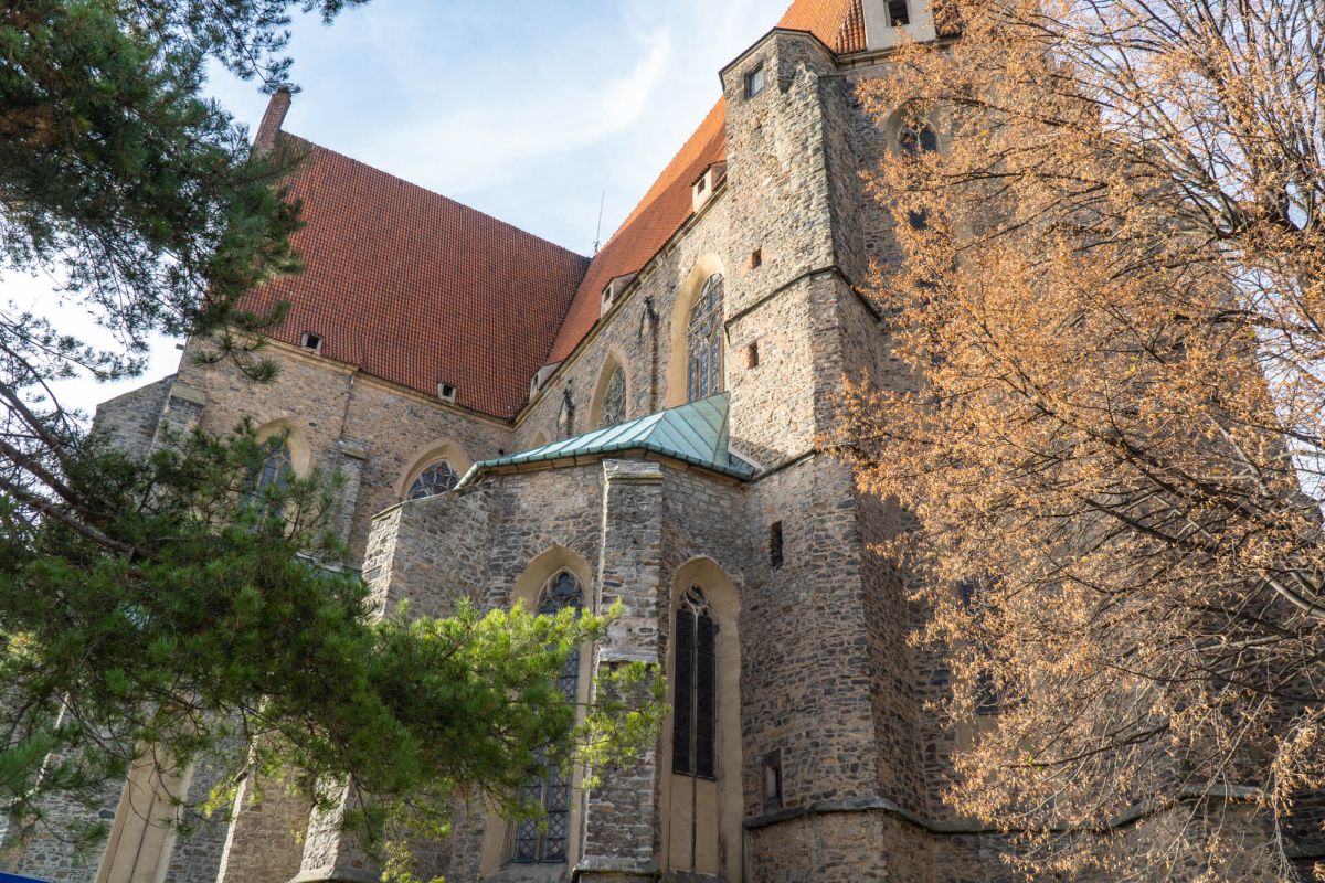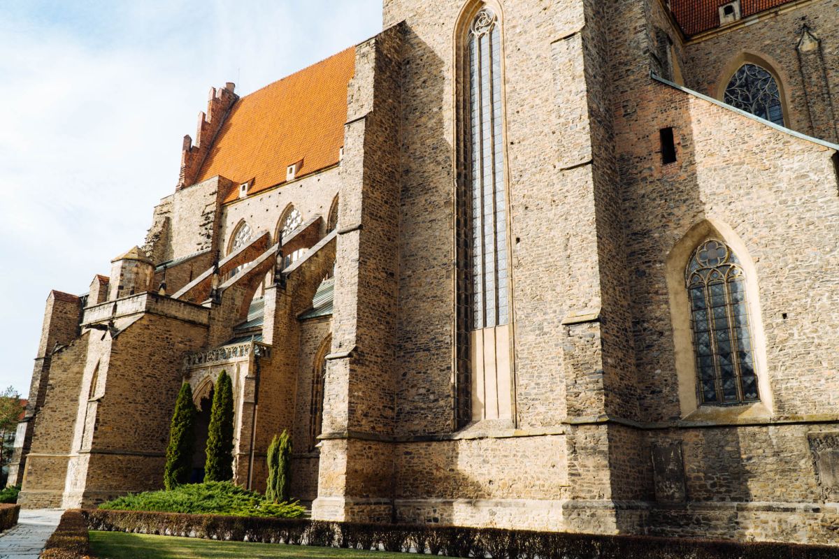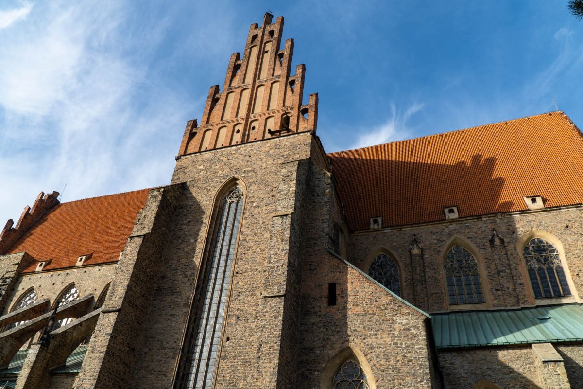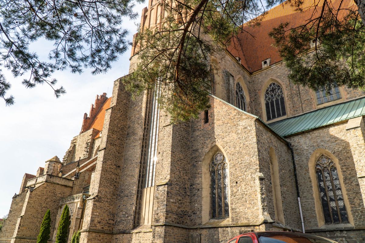 Трехнефная базилика была построена в плане латинского креста с трансептом и алтарем, последний заканчивался многоугольной апсидой. Стены церкви укреплены контрфорсами. Фасад подчеркнут двумя башнями. Северная башня достигает уровня торцевой стены, а южная так и не была достроена. Каменные фасады церкви были украшены архитектурными и скульптурными деталями из песчаника, в том числе горгульями, скульптурными человеческими головами, листвой и геометрическими украшениями на фризах, расположенных под карнизами. Входы в церковь подчеркнуты богато украшенными скульптурными порталами. На орнаментальном фронтоне западного портала (XIV в.) размещены изображения Страшного суда со статуей Христа как судьи мира и изображения Божией Матери и св. Иоанна Богослова. Это единственный сохранившийся в Силезии пример фигурного декора декоративного фронтона, окружающего портал. В тимпан встроен грандиозный ансамбль рельефов и отдельно стоящих скульптур, расположенных в два ряда и образующих визуальное повествование, рассказывающее историю обращения святого Павла на пути в Дамаск. Портал певцов, найденный в венском соборе Святого Стефана, по-видимому, был образцом, на котором базировалось это представление, как с точки зрения его идеологического выражения, так и, в некоторой степени, с точки зрения формы. Скульптурная композиция, разделенная на две отдельные области, также украшает тимпан северного портала (15 век), на котором изображено Коронование Богородицы, а в его нижней части - Коронация Вирсавии Соломоном и Есфири Артаксерксом. Внутри тимпана южного портала (ок. 1400 г.) можно полюбоваться сценой Смерти Девы Марии.