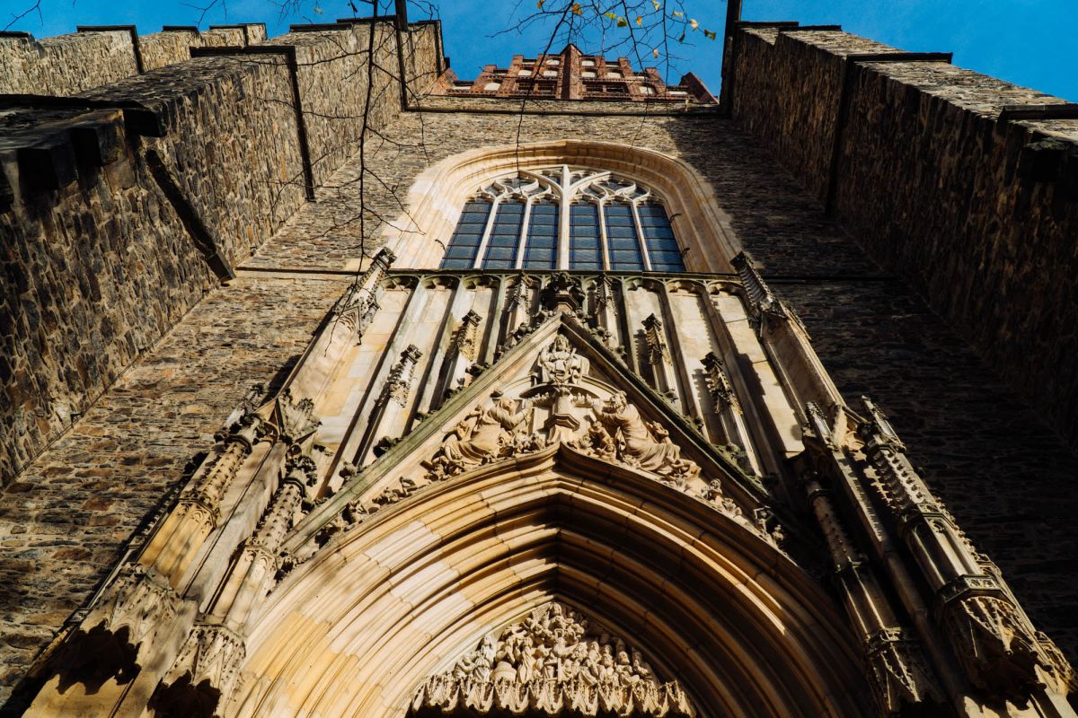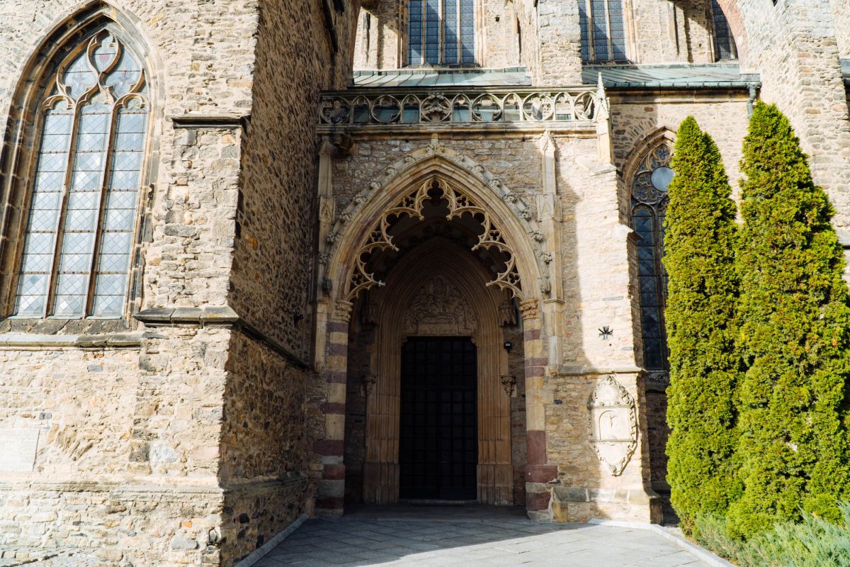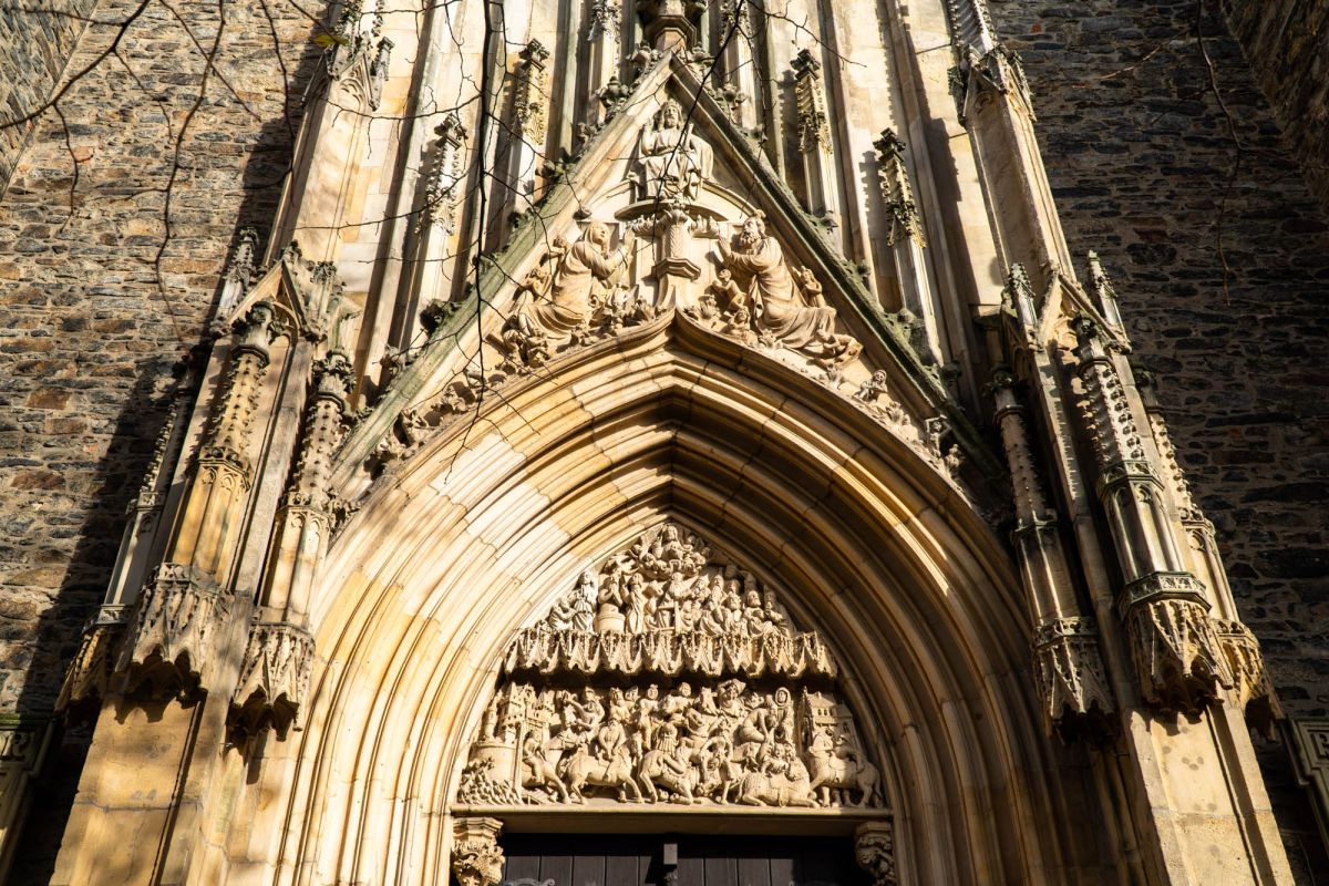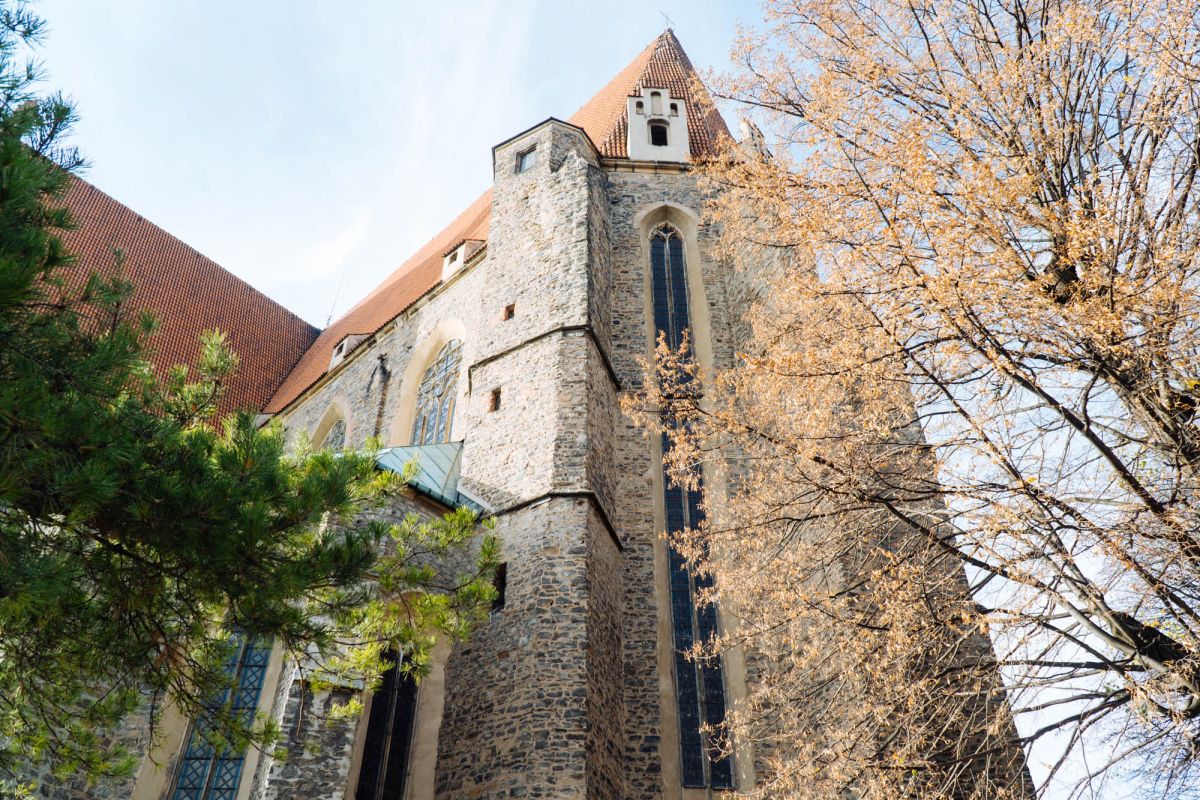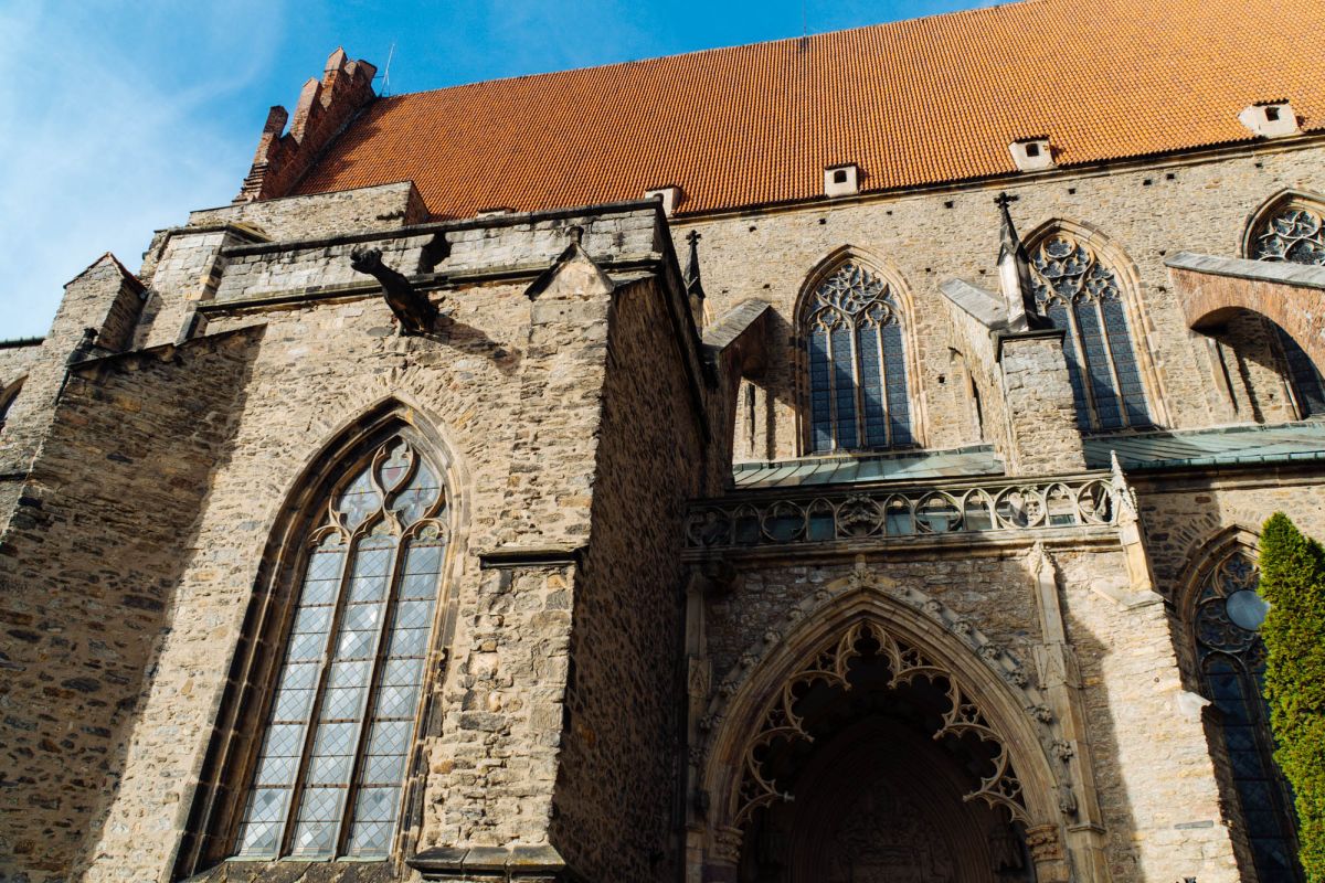 Трехнефная базилика была построена в плане латинского креста с трансептом и алтарем, последний заканчивался многоугольной апсидой. Стены церкви укреплены контрфорсами. Фасад подчеркнут двумя башнями. Северная башня достигает уровня торцевой стены, а южная так и не была достроена. Каменные фасады церкви были украшены архитектурными и скульптурными деталями из песчаника, в том числе горгульями, скульптурными человеческими головами, листвой и геометрическими украшениями на фризах, расположенных под карнизами. Входы в церковь подчеркнуты богато украшенными скульптурными порталами. На орнаментальном фронтоне западного портала (XIV в.) размещены изображения Страшного суда со статуей Христа как судьи мира и изображения Божией Матери и св. Иоанна Богослова. Это единственный сохранившийся в Силезии пример фигурного декора декоративного фронтона, окружающего портал. В тимпан встроен грандиозный ансамбль рельефов и отдельно стоящих скульптур, расположенных в два ряда и образующих визуальное повествование, рассказывающее историю обращения святого Павла на пути в Дамаск. Портал певцов, найденный в венском соборе Святого Стефана, по-видимому, был образцом, на котором базировалось это представление, как с точки зрения его идеологического выражения, так и, в некоторой степени, с точки зрения формы. Скульптурная композиция, разделенная на две отдельные области, также украшает тимпан северного портала (15 век), на котором изображено Коронование Богородицы, а в его нижней части - Коронация Вирсавии Соломоном и Есфири Артаксерксом. Внутри тимпана южного портала (ок. 1400 г.) можно полюбоваться сценой Смерти Девы Марии.
