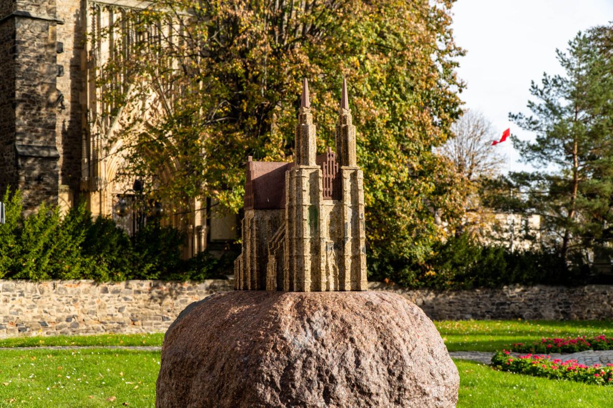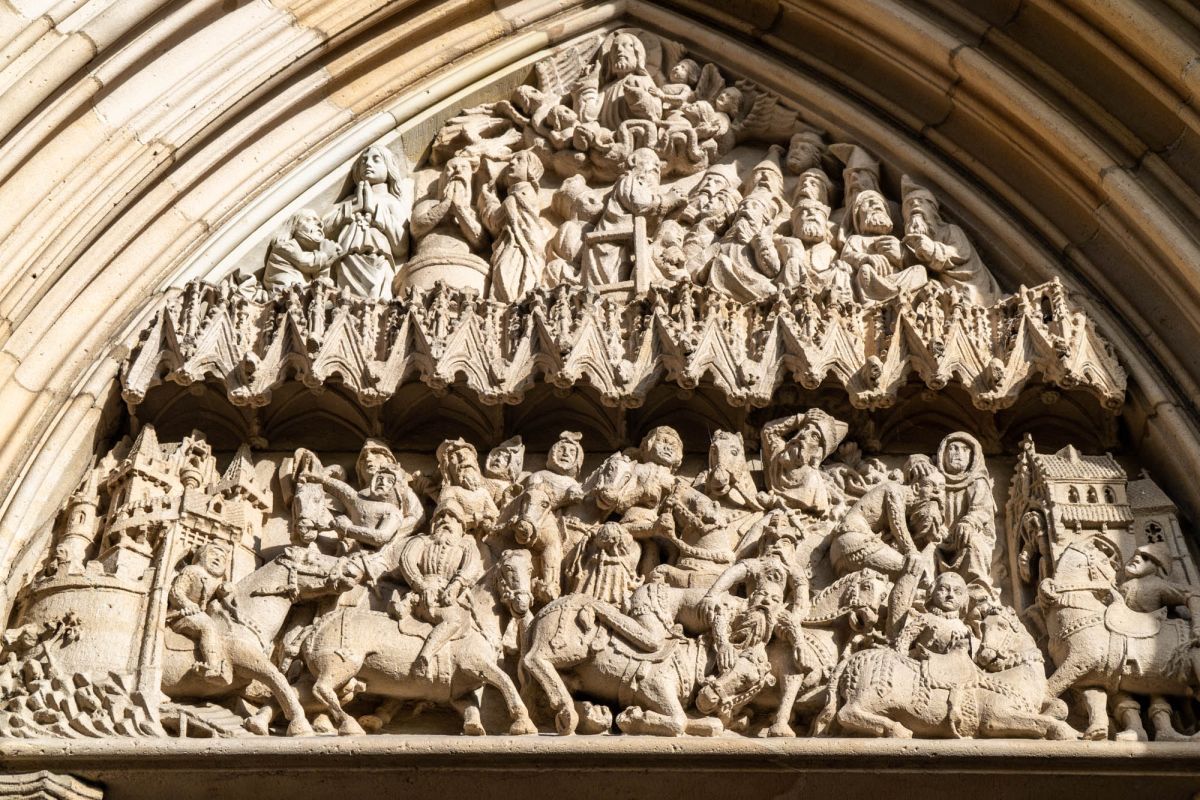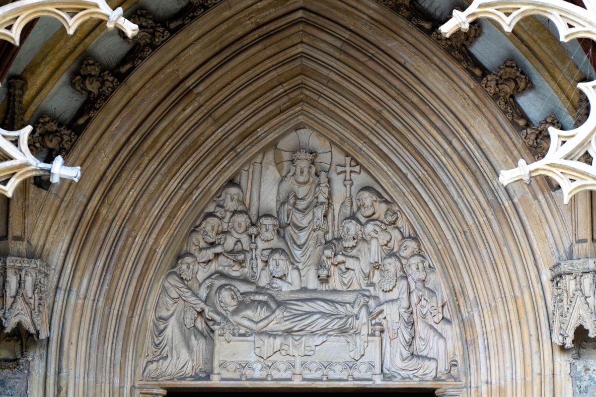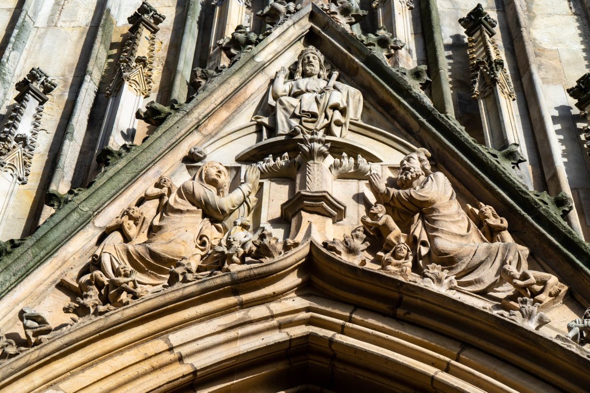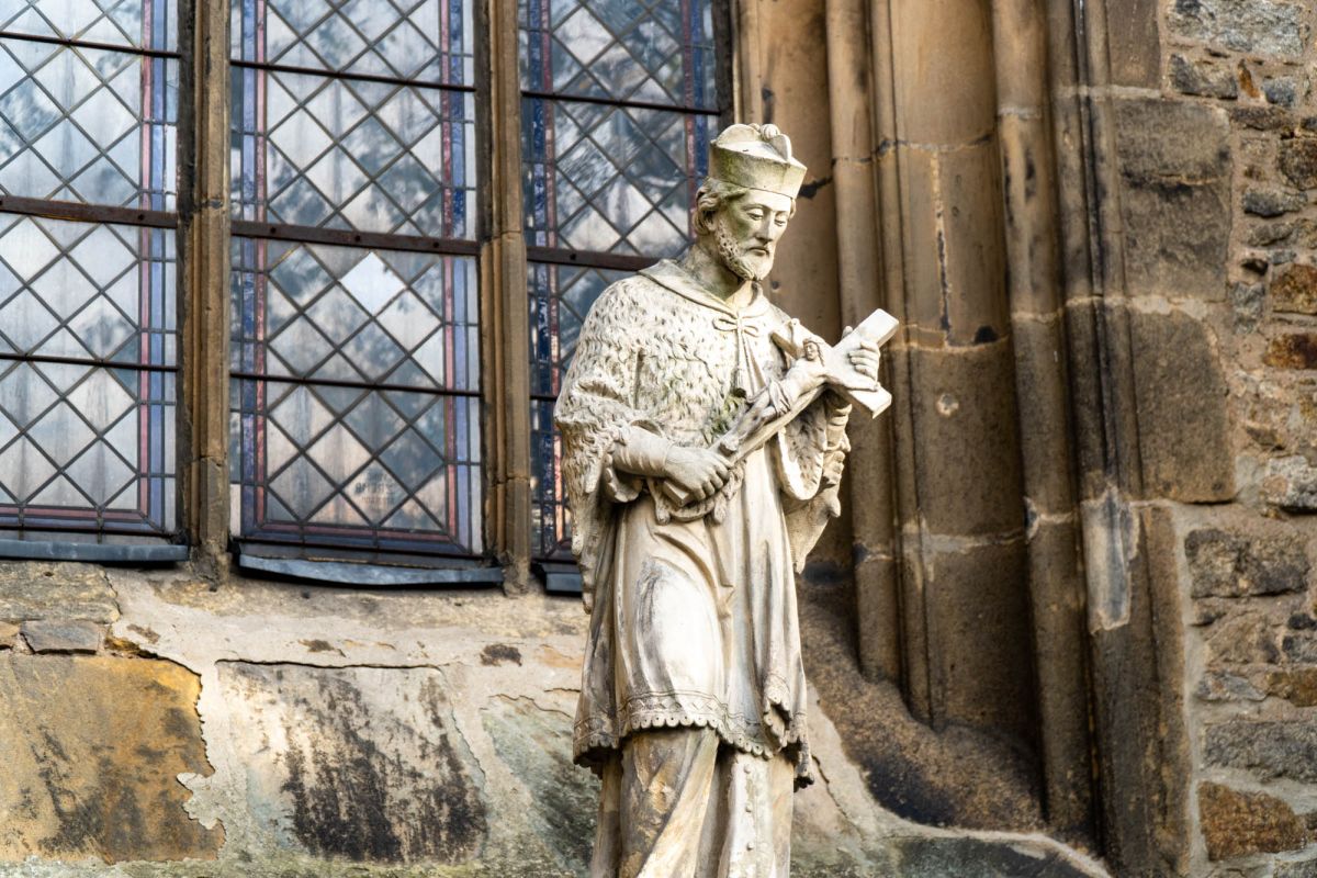 Трехнефная базилика была построена в плане латинского креста с трансептом и алтарем, последний заканчивался многоугольной апсидой. Стены церкви укреплены контрфорсами. Фасад подчеркнут двумя башнями. Северная башня достигает уровня торцевой стены, а южная так и не была достроена. Каменные фасады церкви были украшены архитектурными и скульптурными деталями из песчаника, в том числе горгульями, скульптурными человеческими головами, листвой и геометрическими украшениями на фризах, расположенных под карнизами. Входы в церковь подчеркнуты богато украшенными скульптурными порталами. На орнаментальном фронтоне западного портала (XIV в.) размещены изображения Страшного суда со статуей Христа как судьи мира и изображения Божией Матери и св. Иоанна Богослова. Это единственный сохранившийся в Силезии пример фигурного декора декоративного фронтона, окружающего портал. В тимпан встроен грандиозный ансамбль рельефов и отдельно стоящих скульптур, расположенных в два ряда и образующих визуальное повествование, рассказывающее историю обращения святого Павла на пути в Дамаск. Портал певцов, найденный в венском соборе Святого Стефана, по-видимому, был образцом, на котором базировалось это представление, как с точки зрения его идеологического выражения, так и, в некоторой степени, с точки зрения формы. Скульптурная композиция, разделенная на две отдельные области, также украшает тимпан северного портала (15 век), на котором изображено Коронование Богородицы, а в его нижней части - Коронация Вирсавии Соломоном и Есфири Артаксерксом. Внутри тимпана южного портала (ок. 1400 г.) можно полюбоваться сценой Смерти Девы Марии.