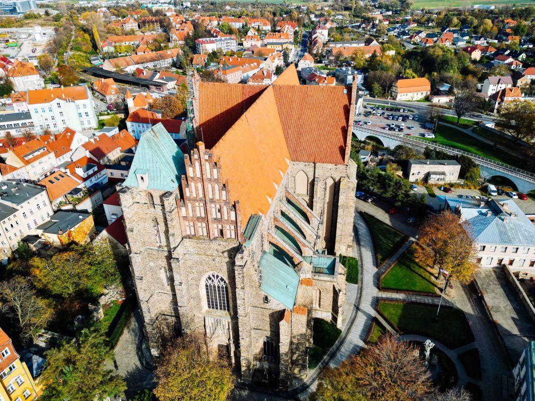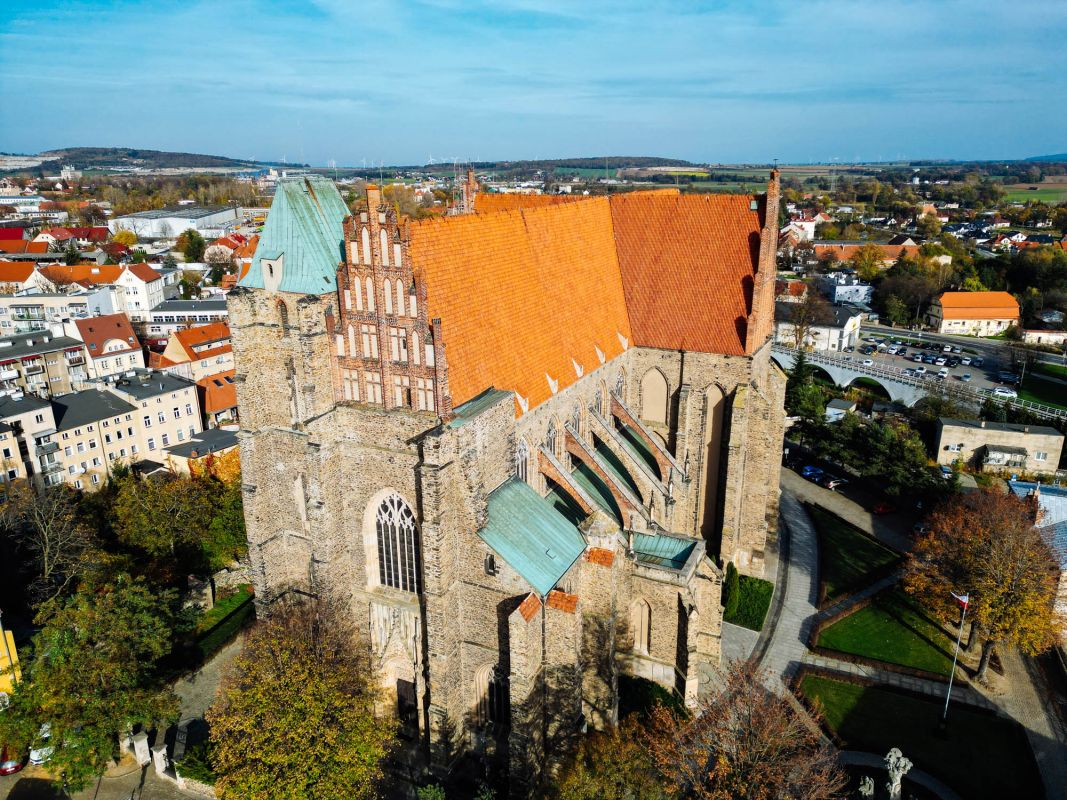 С 1202 по 1203 год здесь существовало командование ордена Святого Иоанна, а в юго-восточной части города располагалась церковь Святых Апостолов Петра и Павла. Это один из крупнейших храмов Нижней Силезии. Его внушительные размеры, каменные стены, крутая крыша и то, как он идеально вписывается в окружающий ландшафт, позволили ему сохранить свое монументальное, возвышающееся присутствие, несмотря на прошедшие столетия. Неф церкви, включая своды проходов, был возведен в 1335-1370 годах, заменив собой более старый храм, который изначально стоял на том же месте. В 1370-1425 годах были построены периферийные стены трансепта, алтарь, ризница и портик. Во 2-й половине 15 в. главный неф получил свод; только в 1522 году была собрана органная галерея. Известно, что около 1390 года строительством костела руководил Якуб из Свидницы.