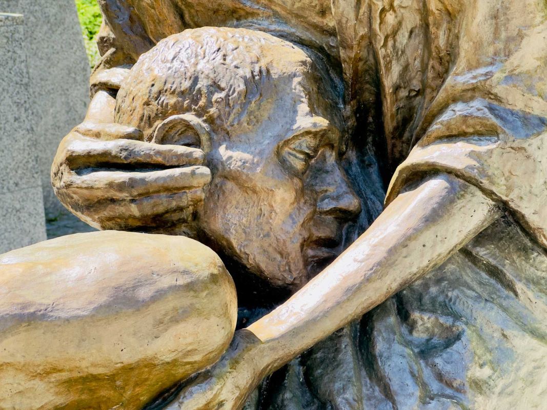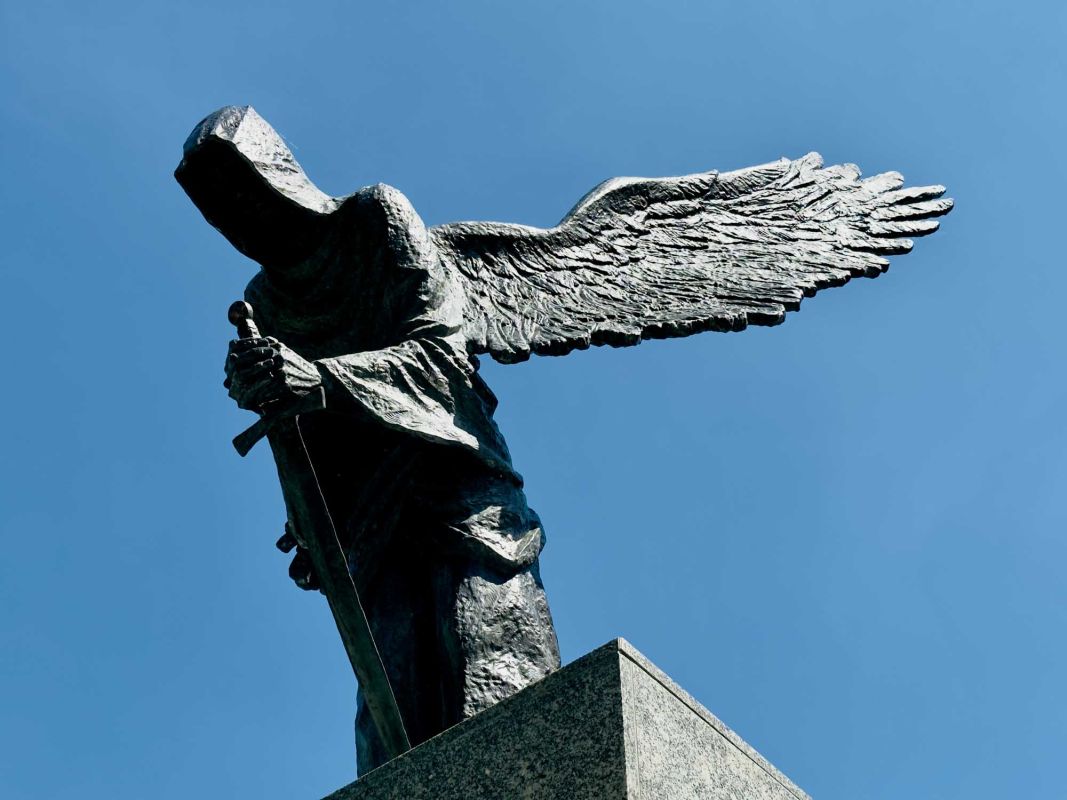 Памятник расположен крестообразно в плане, на площади 380 м2. Он представляет собой четыре гранитные плиты и две бронзовые фигуры: Ангела Смерти и Катынской Пьеты - Матери-Родины, держащей на руках убитого узника. На стене постамента с левой стороны высечены названия мест преступлений, а на постаменте с правой стороны - названия лагерей военнопленных.
