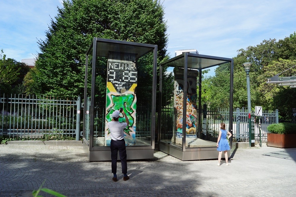 Хотя большая часть граффити была нанесена, когда стена разделила Берлин на две части, художники продолжали украшать стену после ее падения. Предмет в левой витрине не без небольшой ошибки напоминает о важном международном спортивном событии 2009 года: фигуры новые – и все еще актуальные! - Мировой рекорд на 100 метров, установленный Усейном Болтом в Берлине. Художник ошибся: время было 9.58, а не 9.85!