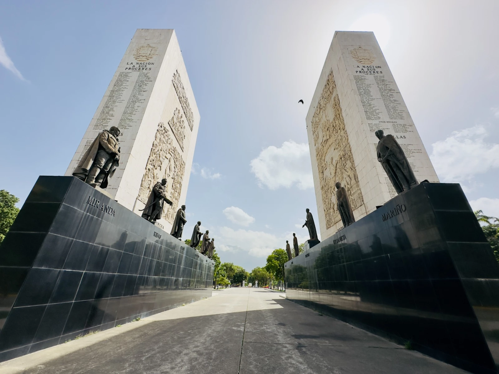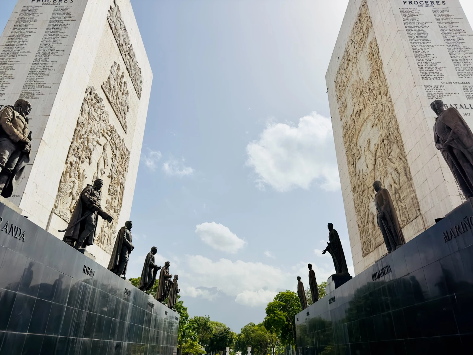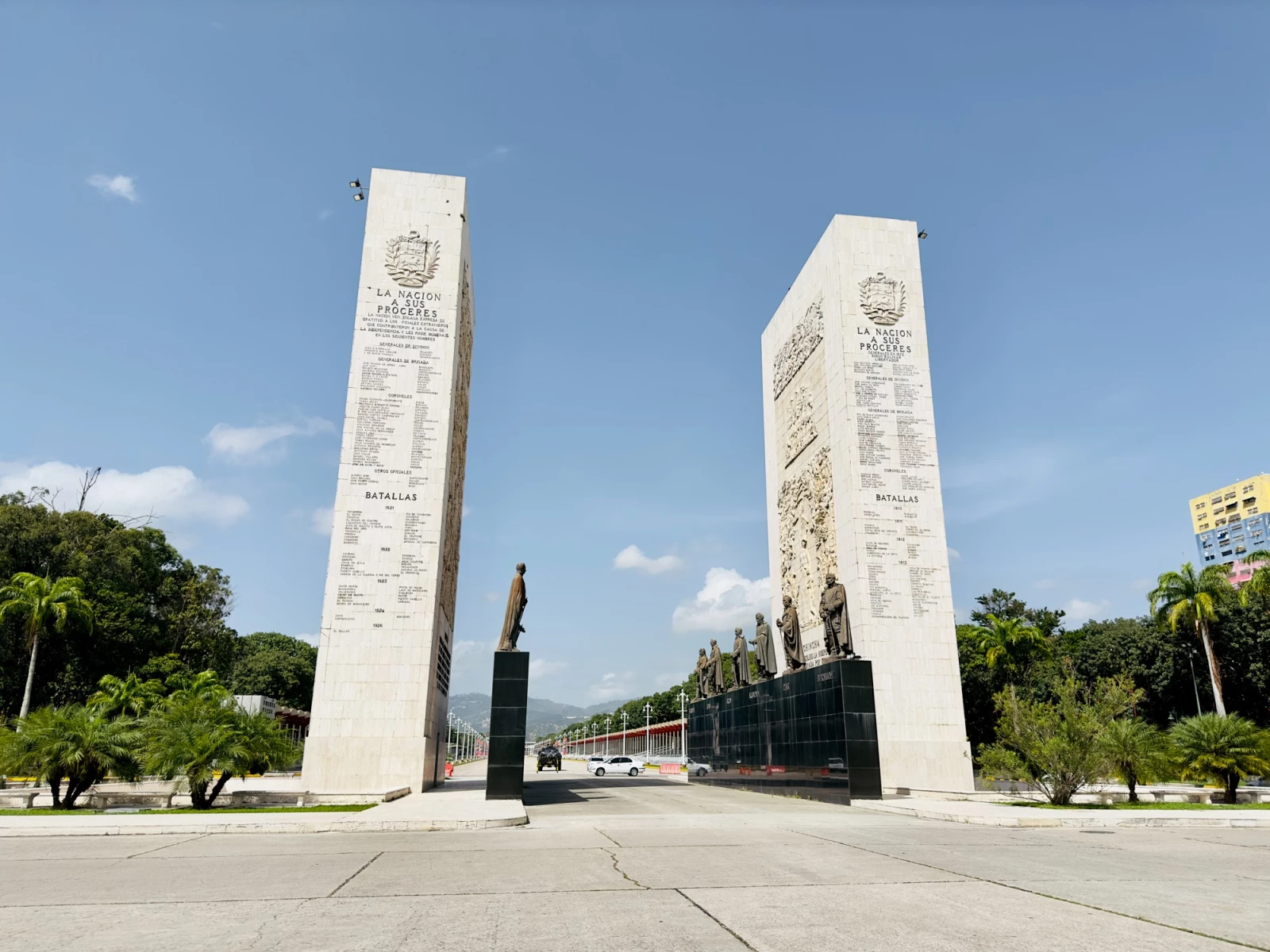А по горизонтали выделяются бронзовые статуи героев независимости, таких как: Симон Боливар, Франсиско де Миранда, Антонио Хосе де Сукре, Маракучо Рафаэль Урданета, Сантьяго Мариньо, Льянеро Хосе Антонио Паес, Мануэль Пиар, Хосе Феликс Рибас, Луис Брион и другие.