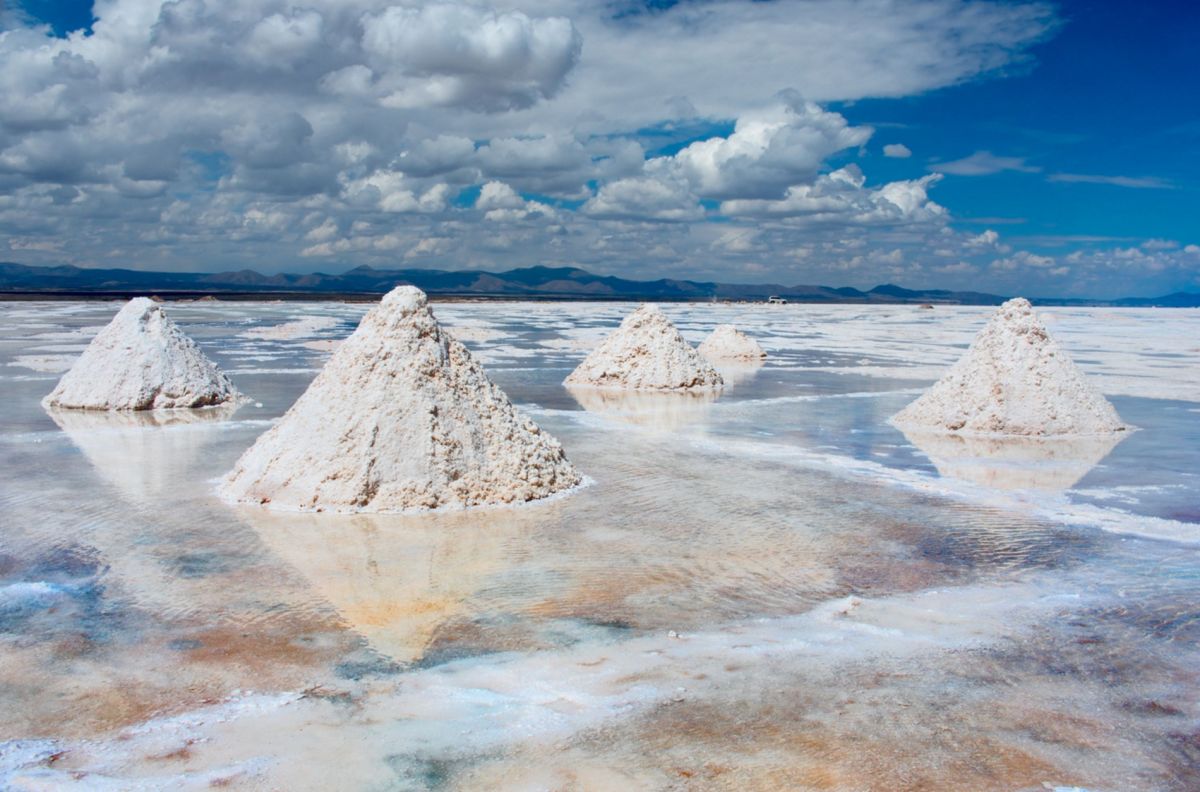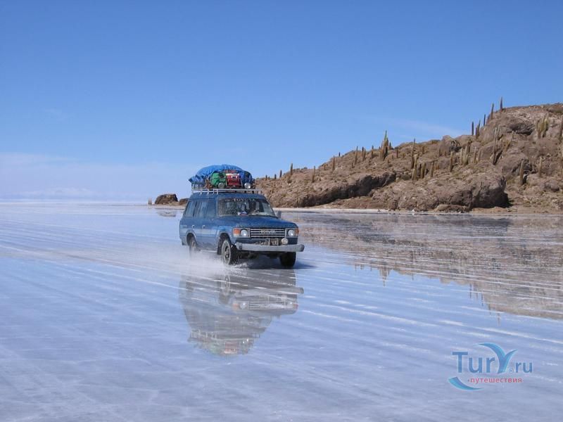 Вот в этих не очень гостеприимных местах и раскинулся огромный солончак Уюни. Издалека он напоминает огромное озеро, собственно, когда-то это место им и было. Его площадь около 10 тысяч км2. Для полного сходства с водоемом среди соляных просторов иногда встречаются участки земли и камней, которые местные жители называют островами. На островах растут огромные кактусы, другие растения не справляются с особенностями местной почвы. Поверхность белоснежной равнины очень похожа на лед. Особенно в тех местах, где аборигены добывают соль. Добыча ведется очень простым способом: соль на поверхности просто сгребают в огромные кучи, а позже лопатами забрасывают в подъехавший грузовик. После такого соскабливания поверхность становится ровной, гладкой и блестящей. Можно было бы добывать соль и из глубины – толщина соляного покрова в этих местах варьируется от 2 до 8 метров, но зачем прилагать усилия, если и сверху полным-полно добра.