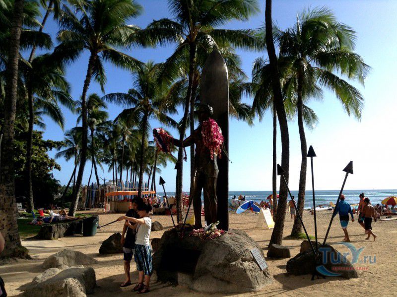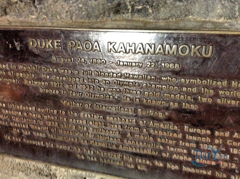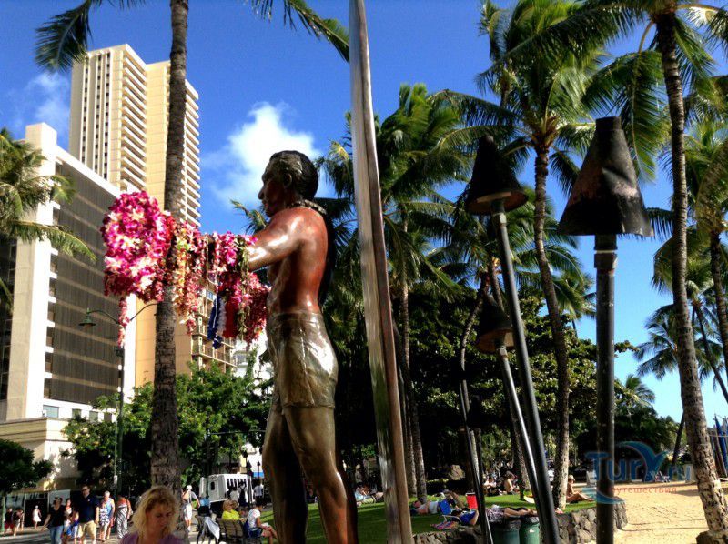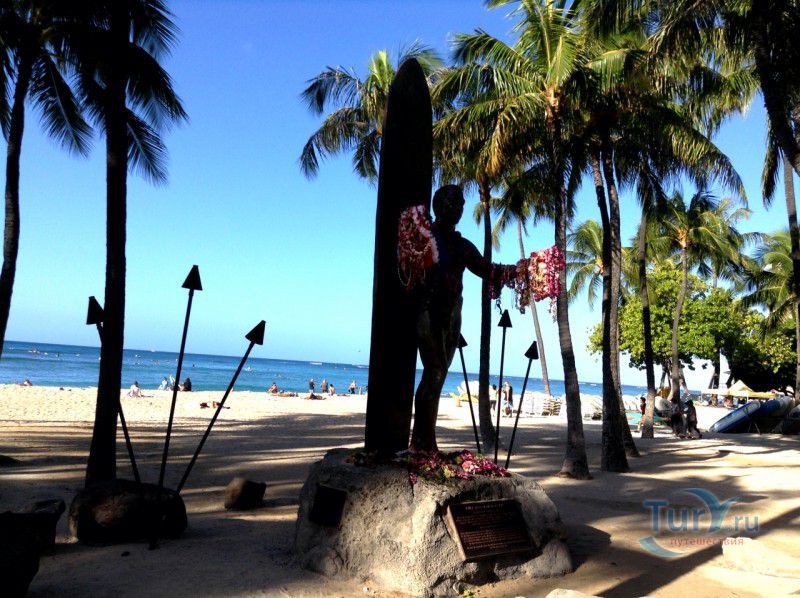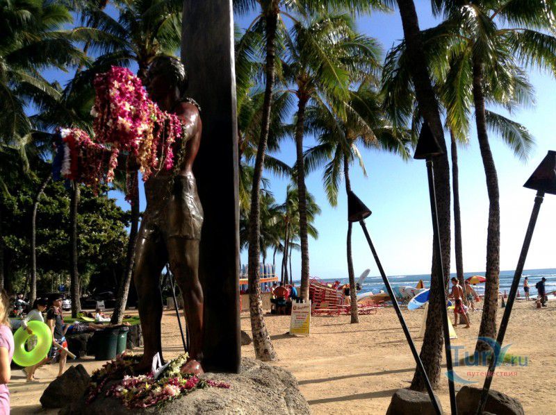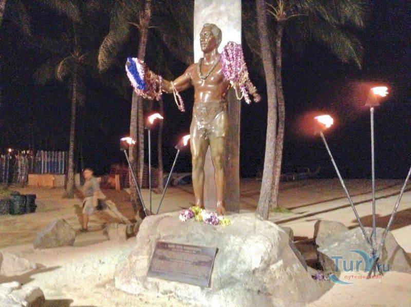 Памятник знаменитому американскому спортсмену-пловцу гавайского происхождения, олимпийскому чемпиону и киноактёру Дюку Каханамоку (Duke Paoa Kahanamoku) установлен в центральной части пляжа Вайкики, в районе Кухио-бич парка (Kuhio Beach Park). Дюк Каханамоку любим и почитаем жителями Гавайев за то, что привлек внимание спортсменов и туристов к этим островам, популяризировав на Гавайях винсерфинг. Скульптура изображает спортивного человека в позе победителя, за спиной которого стоит доска для виндсерфинга.