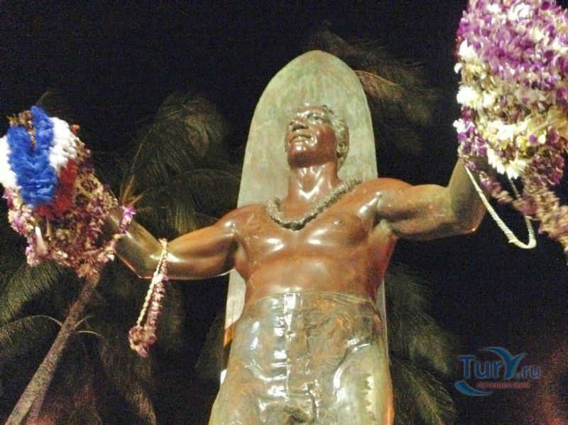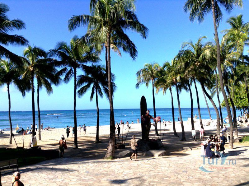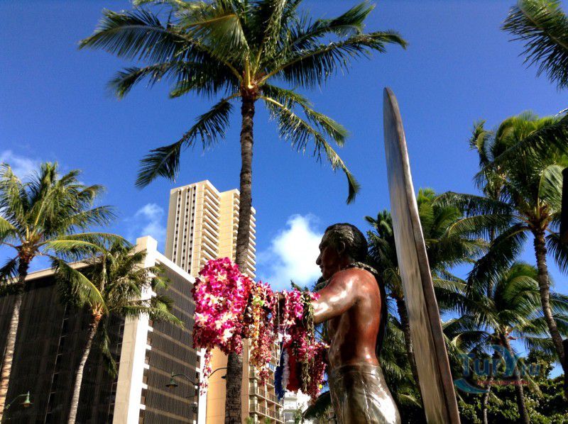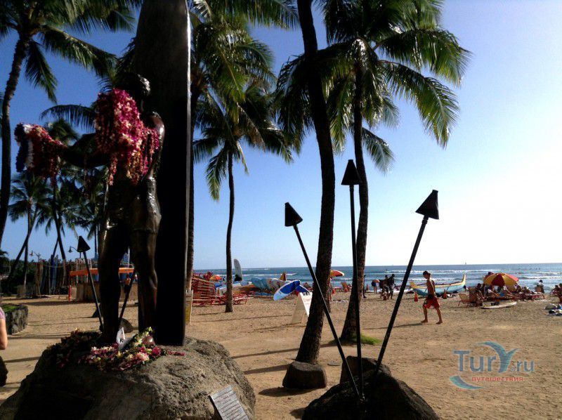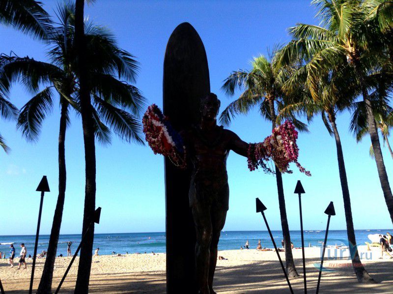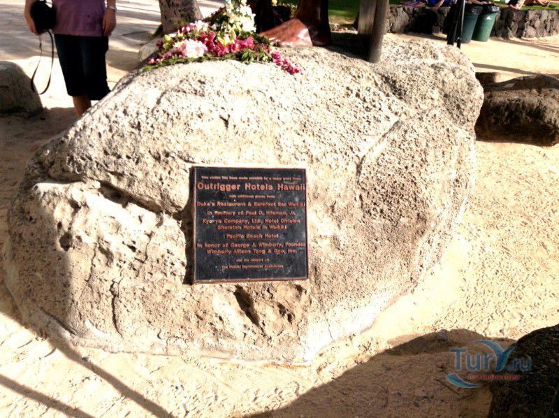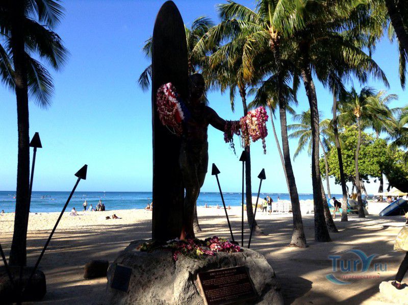 Памятник знаменитому американскому спортсмену-пловцу гавайского происхождения, олимпийскому чемпиону и киноактёру Дюку Каханамоку (Duke Paoa Kahanamoku) установлен в центральной части пляжа Вайкики, в районе Кухио-бич парка (Kuhio Beach Park). Дюк Каханамоку любим и почитаем жителями Гавайев за то, что привлек внимание спортсменов и туристов к этим островам, популяризировав на Гавайях винсерфинг. Скульптура изображает спортивного человека в позе победителя, за спиной которого стоит доска для виндсерфинга.