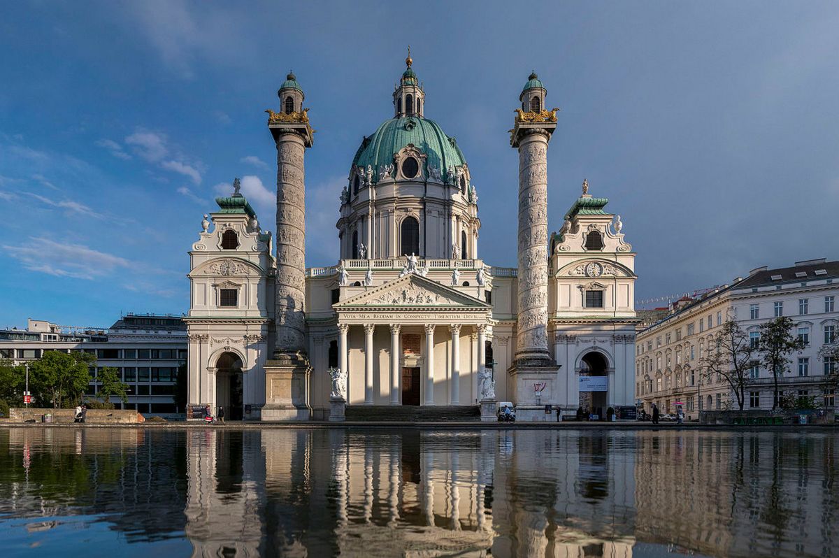 Величественная церковь Карлскирхе расположена в южной части Карлсплаца, на окраине Внутреннего города, рядом с Рингштрассе. Центральная часть фасада напоминает греческий храм, а боковые капеллы стилистически заимствованы у итальянского Возрождения. Их крыши похожи на китайские пагоды. Прообразом триумфальных колонн стали римский стелы, но одновременно их силуэты напоминают и мусульманские минареты. Две фигуры ангелов перед входом символизируют Ветхий и Новый Завет, а четыре больших скульптуры на фронтоне - четыре добродетели: Покаяние, Милосердие, Смирение и Веру. В центре восседает на троне Карл Борромей, небесный патрон, который спас город от чумы, и которому Карл VI дал обет построить этот храм за спасение от чумы в 1713 году.