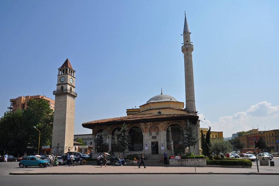 Мечеть Этхем Бей - исторический памятник, который в гармонии с Часовой башней формирует монументальный комплекс из достопримечательностей города, входящий в маршрут каждого посетителя, прибывшего в Тирану. Постройка мечети началась в 1789 году Мулой Беем. Строительство длилась вплоть до 1831 года и было завершено уже сыном Муллы Бея - Хаджи Этхем Беем. Комната для молитвы, охваченная куполом, портиком и минаретом, составляет внутреннюю часть храма. Внутреннее освещение достигается посредством пяти окон в каждой стене. В северной части есть только входные ворота. Перед входной дверью есть молитвенная площадка. Портик базируется на основании, каменный бордюр вокруг которого был сделан только в 1940 году. Портик окружен 14 арками, помещенными в 15 колонн 1 каменной части, на которой есть украшения в виде растений. Наряду с портиком, Этхему Бею принадлежит также постройка минарета. Мечеть Этхем Бей отличает уникальный стиль башни с освещенным куполом. Общий облик построек вместе с минаретом смотрится очень гармонично. Мечеть объявлена культурным памятником, находящимся под защитой государства.