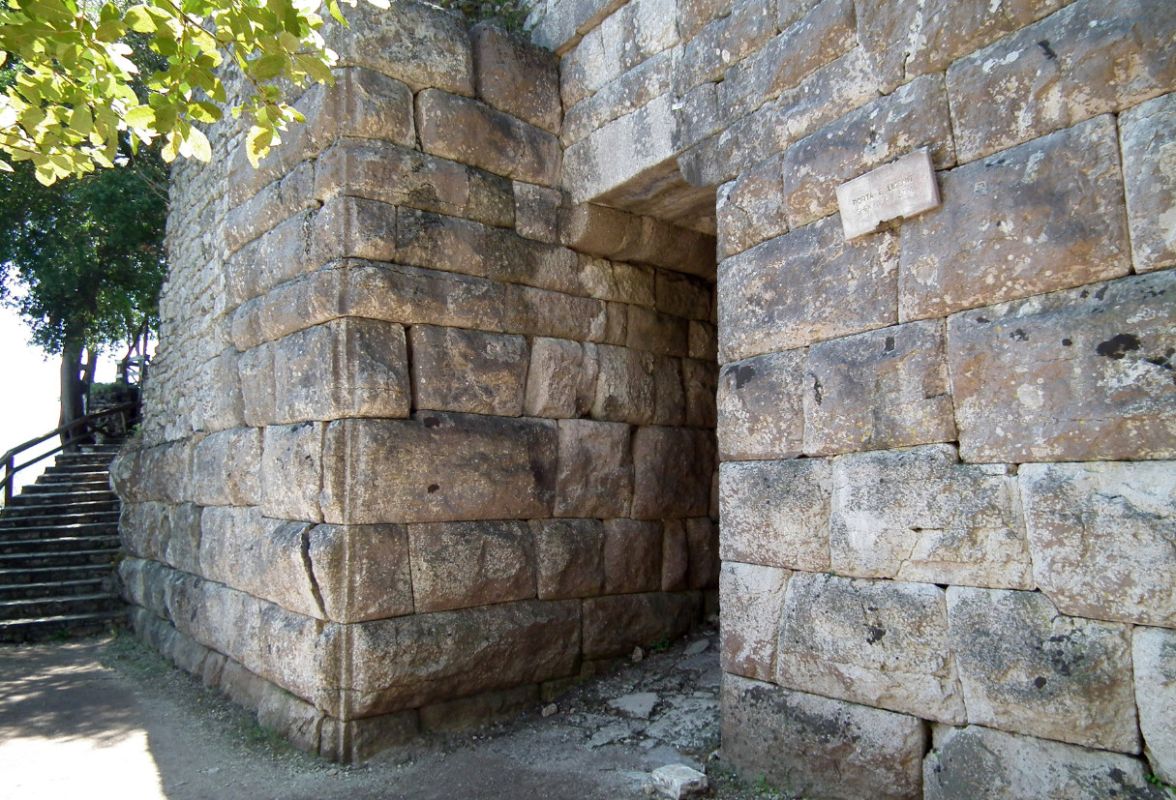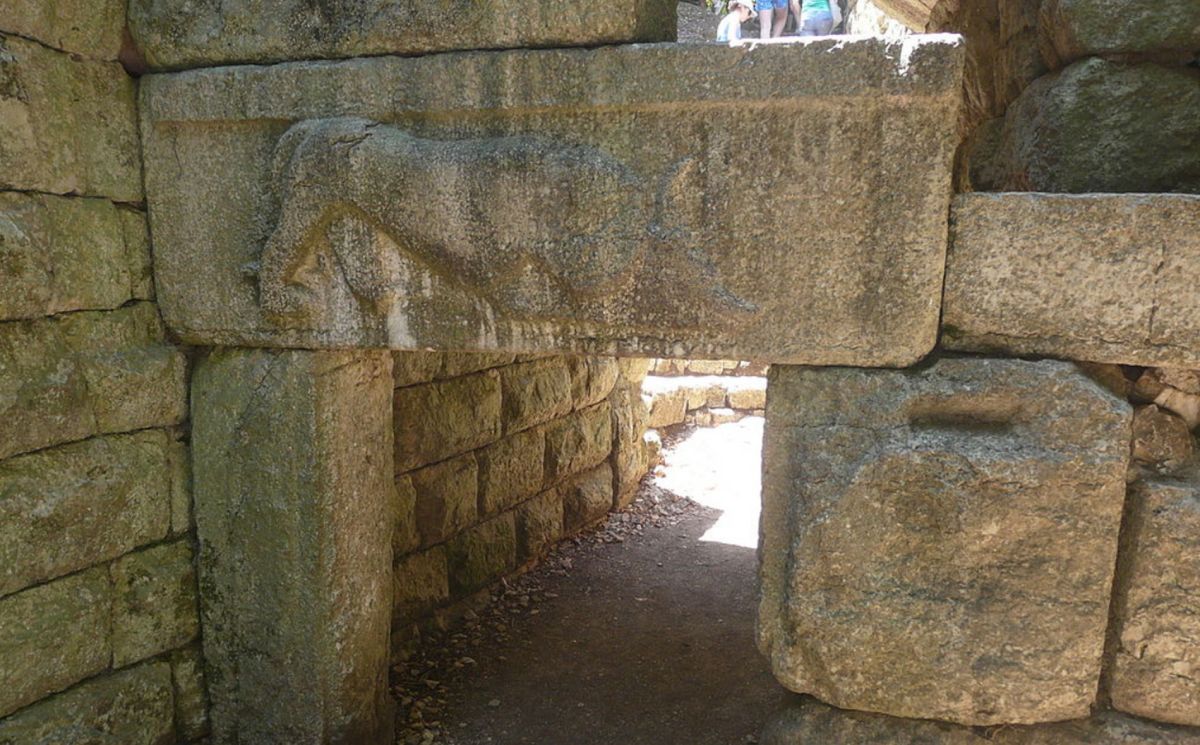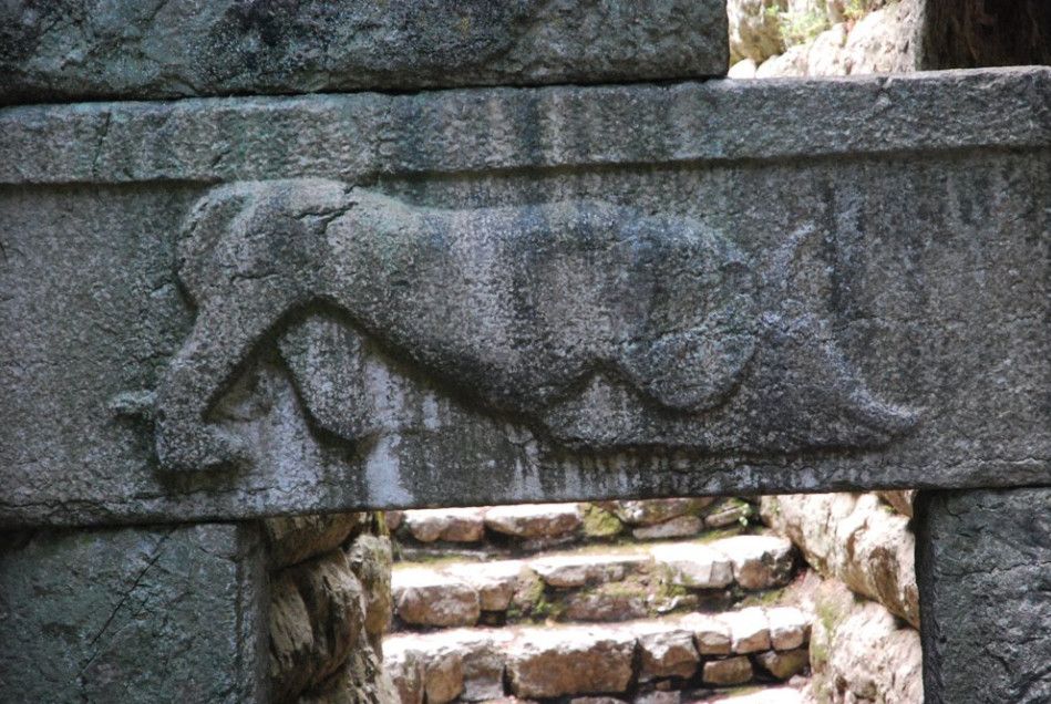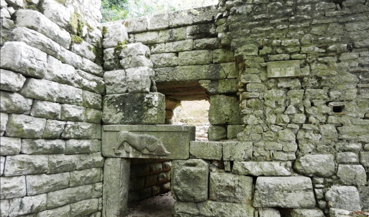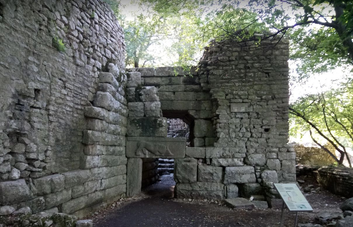 Так называемые Ворота Льва берут свое имя от рельефного изображения льва, пожирающего голову быка, помещенного выше входа. Изображение льва не было частью оригинальной стены, но было помещено сюда в 5-ом столетии нашей эры, чтобы уменьшить размер ворот и облегчить защиту. Рельеф здания храма может датироваться уже с 6-ого столетия до н.э. Родник в воротах был в течение римских времен, связанных с культом нимф. Надпись перед воротами, посвященная гражданину Бутринта, Хунии Руфине, которая заплатила за восстановление родника в 2-ом столетии нашей эры гласит: "Хуния Руфина, друг нимф”. Рельеф здания из известняка, расположенного ближе к Воротам Льва, намного более ранний, чем старинные ворота, которые были построены позже. Стилистически рельеф может быть датирован 6-ым столетием до н.э. Рельеф изображает в профиле льва, который пожирает голову быка. Голова и шея быка показана между челюстей льва, и только его рога ясно прорисованы и обеспечивают идентификацию животного. От льва не сохранились его передние лапы, и так же вся детализация головы была стерта, кроме слабой схемы одного скругленного уха.