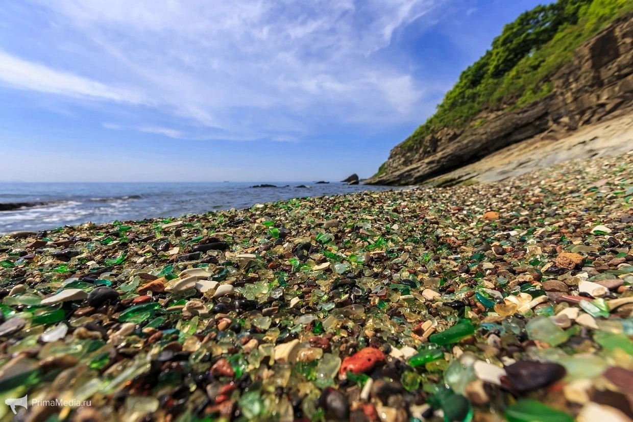 Бухта Стеклянная, расположенная примерно в 10 километрах от восточной окраины Владивостока, является уникальной достопримечательностью Приморского края. Её пляж покрыт множеством разноцветных стеклянных осколков, отполированных морскими волнами до состояния гладкой гальки. Эти стеклянные "камушки" образовались из-за бутылок и фарфоровых изделий, которые попадали в бухту с близлежащей свалки.