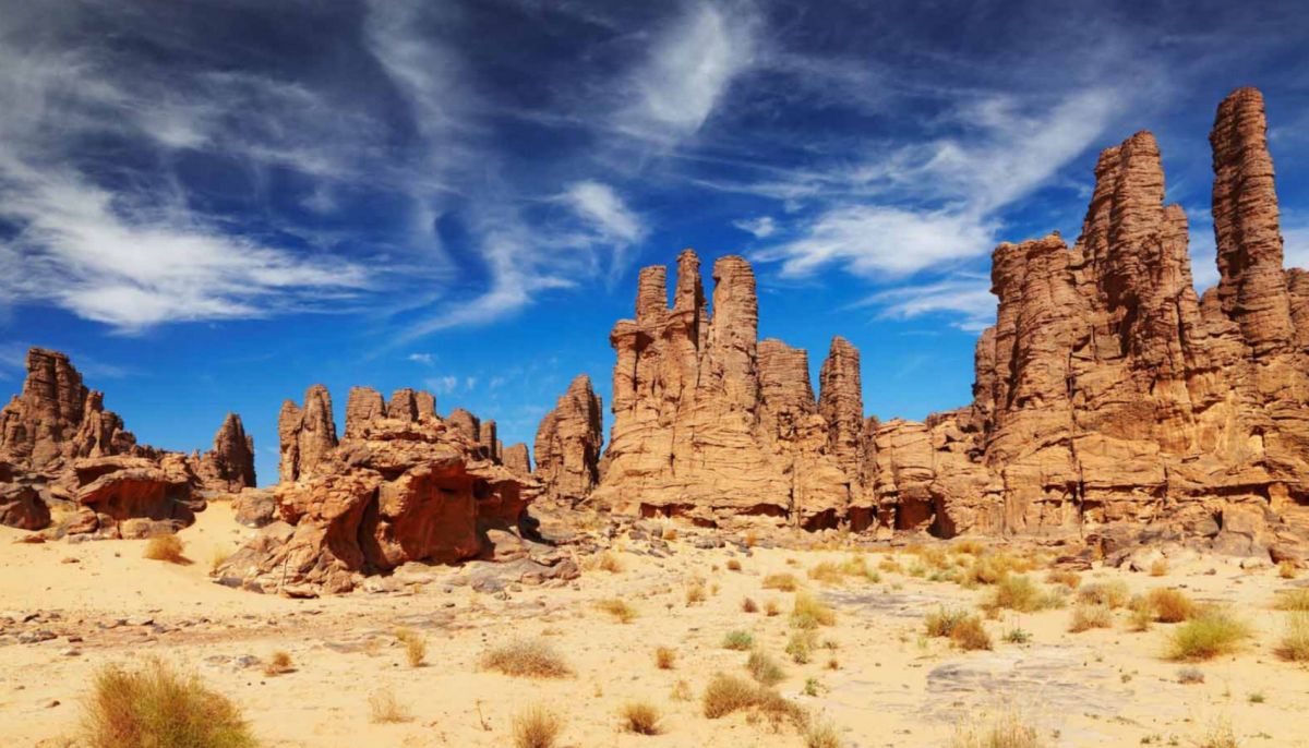 Тассилин-Аджер - песчаное скальное образование, расположенное на обширном плато в пустыне Сахара, на юго-востоке Алжира, на границе Ливии, Нигера и Мали. Плато занимает территорию площадью 72 000 квадратных километров, с 1982 года Тассилин-Аджер внесен в список Всемирного наследие ЮНЕСКО под названием «Национальный парк Тассилин-Аджер». Горная гряда состоит из песчаника, в котором, благодаря многовековому воздействию эрозии, образовалось более 300 естественных каменных арок и других скалистых образований, а также множество пещер. Сейчас пейзаж Тассилин-Аджера напоминает каменный лес, состоящий из скал самых разных форм и размеров. Территорию плато прорезают вади - высохшие русла рек, некогда здесь пролегавших. Плато располагается на высоте от 1150 метров до 2158 метров над уровнем моря, из-за высоты и водоудерживающих свойств песчаника флора здесь несколько богаче, чем в окружающей парк пустыне. Редколесья состоят из находящихся под угрозой исчезновения эндемиков - кипариса сахарского и сахарского мирта. Всемирную известность Тассилин-Аджеру принесли обнаруженные здесь в 1910 году огромные яркие рисунки, изображающие людей, животных и сцены из жизни живших здесь племён. Всего в Тассилин-Аджере было обнаружено 15 000 петроглифов и множество археологических объектов (орудия труда, наконечники стрел, скребки, кости, зернотёрки, каменные ножи) разных периодов истории. Рисунки изображают стада крупного рогатого скота, огромных диких животных (слонов, носорогов, жирафов, гиппопотамов, крокодилов, страусов, антилоп и вымерших видов буйволов) и являются свидетелями эволюции человечества на краю Сахары. Наскальные рисунки Тассилин-Аджера относятся к огромному промежутку истории, начиная с 10 000 года до нашей эры и заканчивая первыми веками нашей эры.